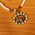 This handcrafted beautiful pendant set Is made in silver alloy with imitation ruby colour red stone & pearls and kundan with meenakari work of extremely fine quality. This gorgeous pendant set is handcrafted with fine engravings done with hand and is plated 18kt nickle free gold rhodium that gives the design a real look . the pendant comes with a matching pair of earrings which are absolutely gorgeous and are very light in weight.
