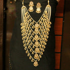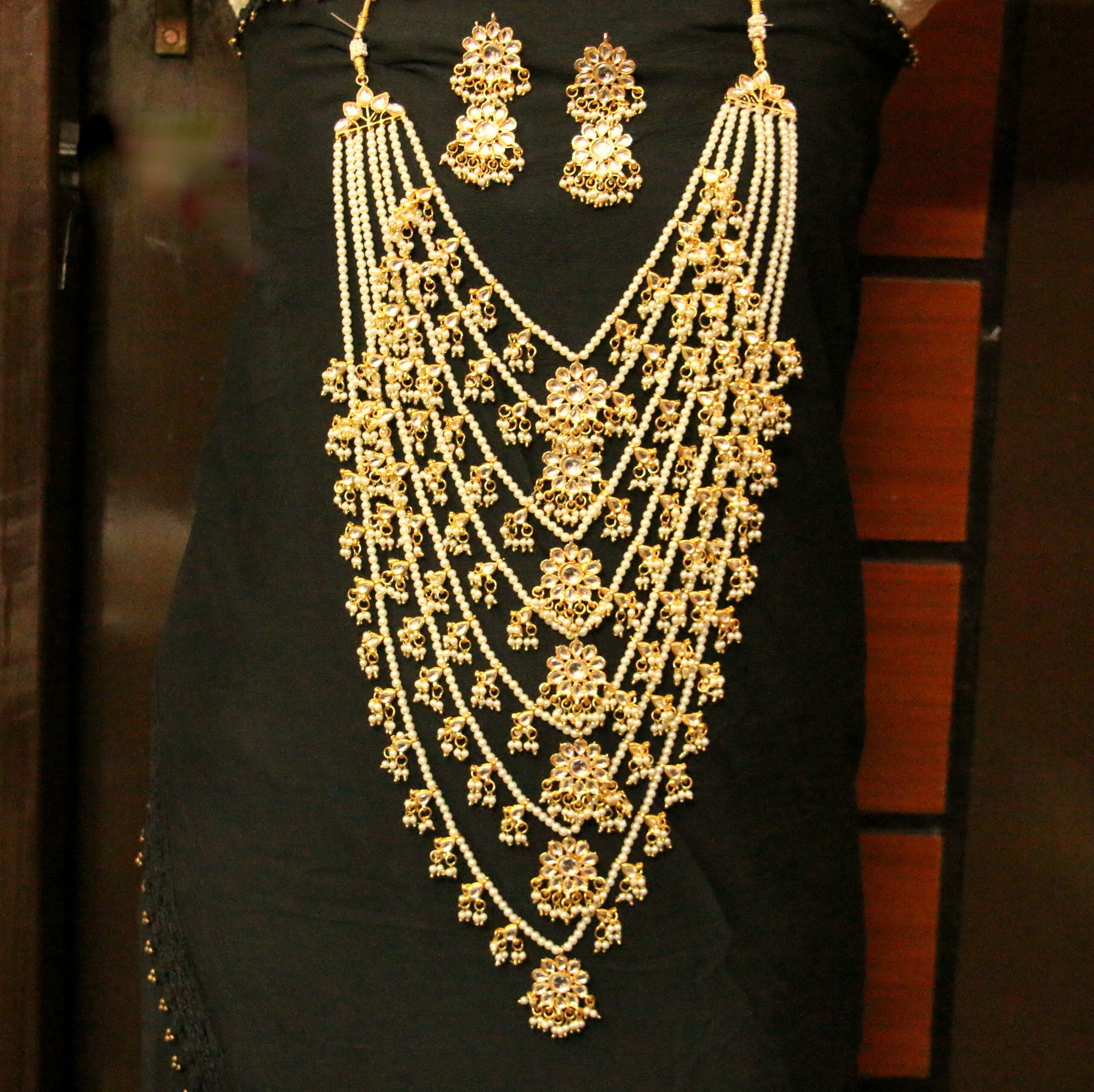 This Necklace is handcrafted is copper alloy and finished in gold plating , the stones used in this necklace are imitation kundan polki stones which are very fine in quality . The gold plating is nickle free and it gives a unique look to the necklace set and also the necklace is light in weight.