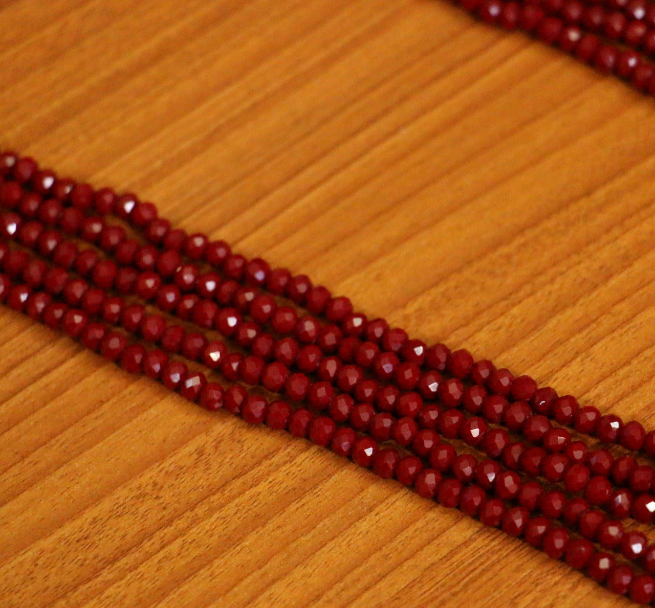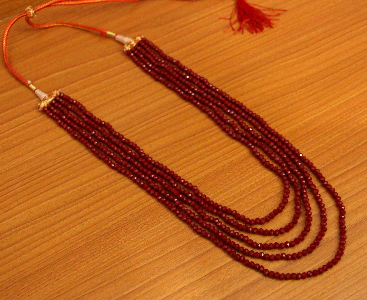 This 5 line maroon colour necklace is handcrafted in imitation maroon swarowski beads , the necklace is very light in weight with an adjustable thread attached to the back .