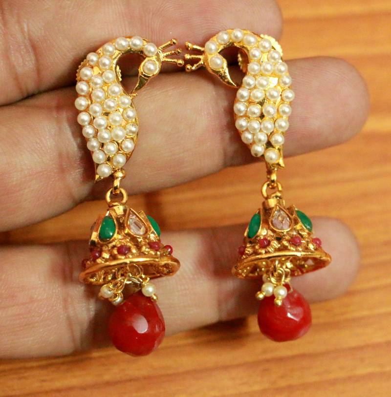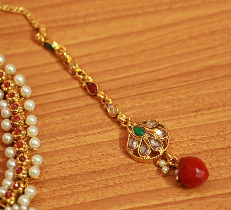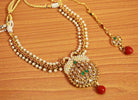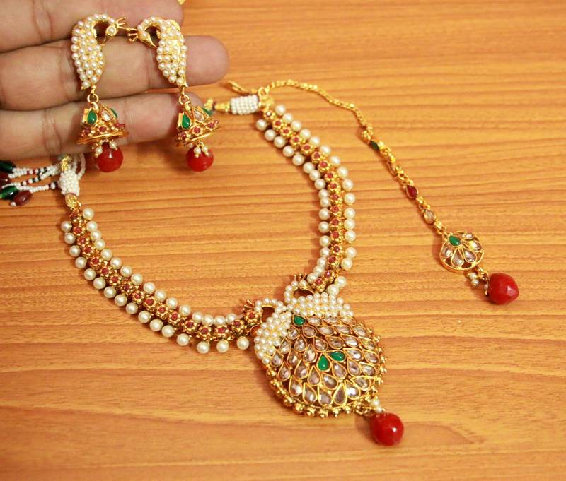This peacock pattern necklace set is handcrafted in copper alloy with fine polki work of fine quality , the necklace set is plated with 18kt nickle free gold plating which gives it a real look .