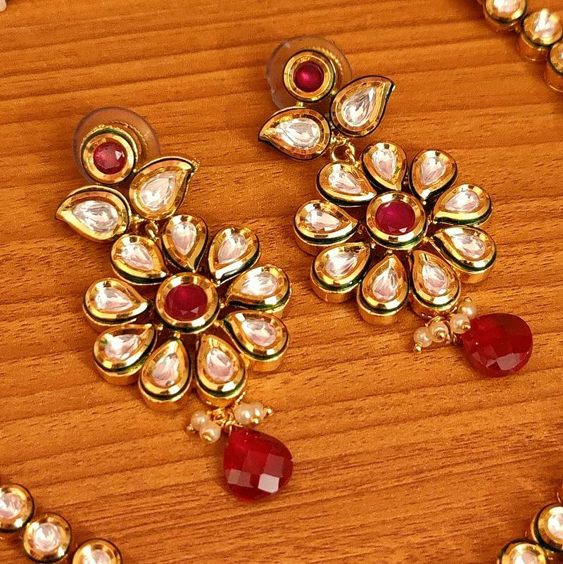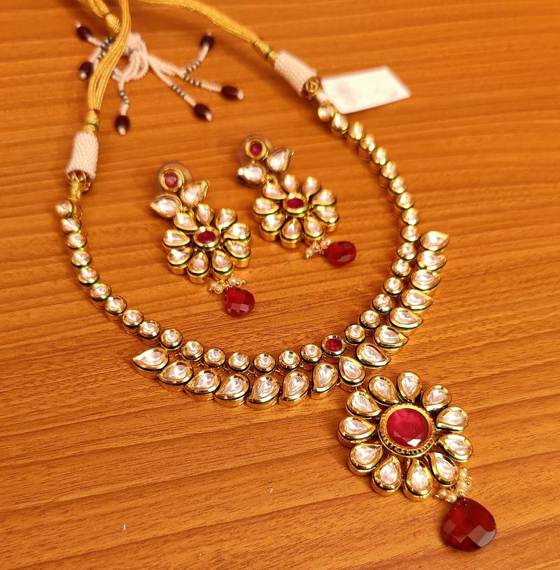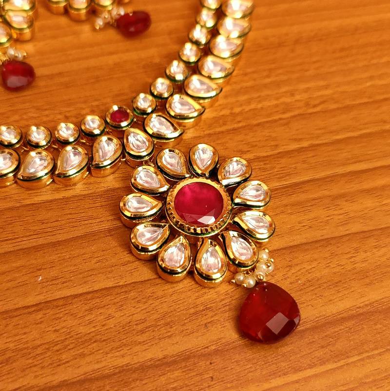This kundan polki necklace set is handcrafted in brass alloy with imitation red colour stone & beads of very fine quality , the necklace set is plated in 18kt gold plating and the design itself is perfect for wedding attires.