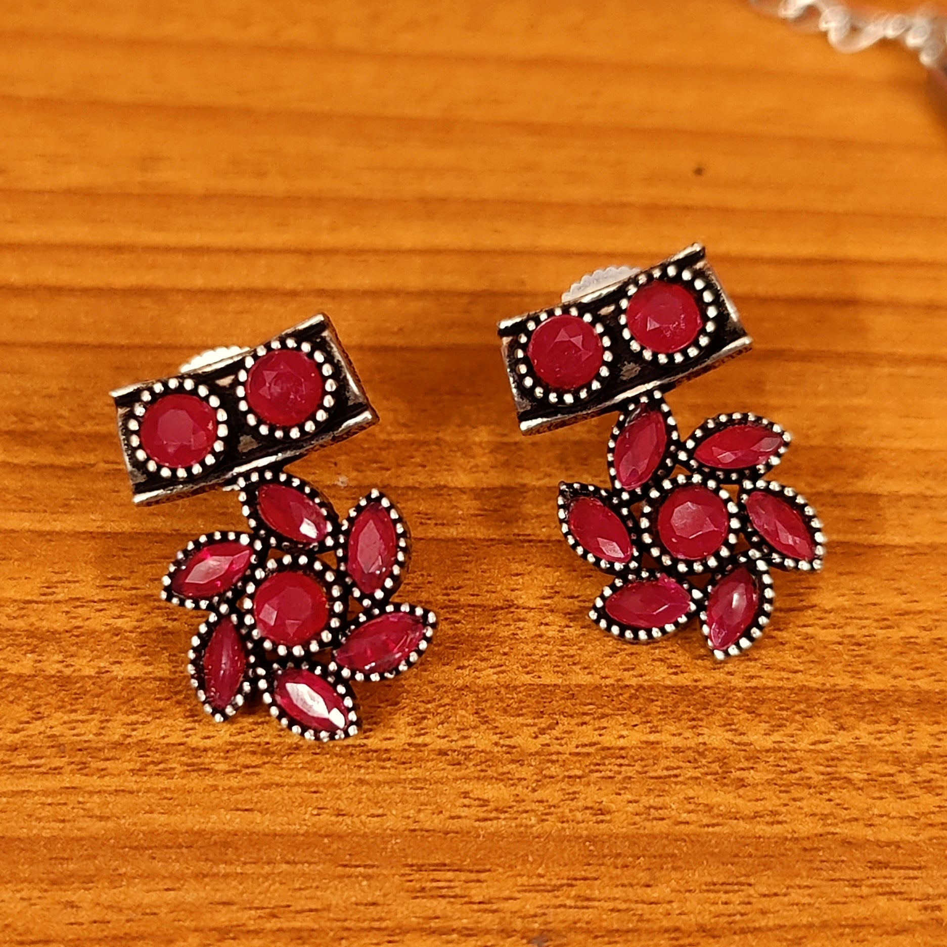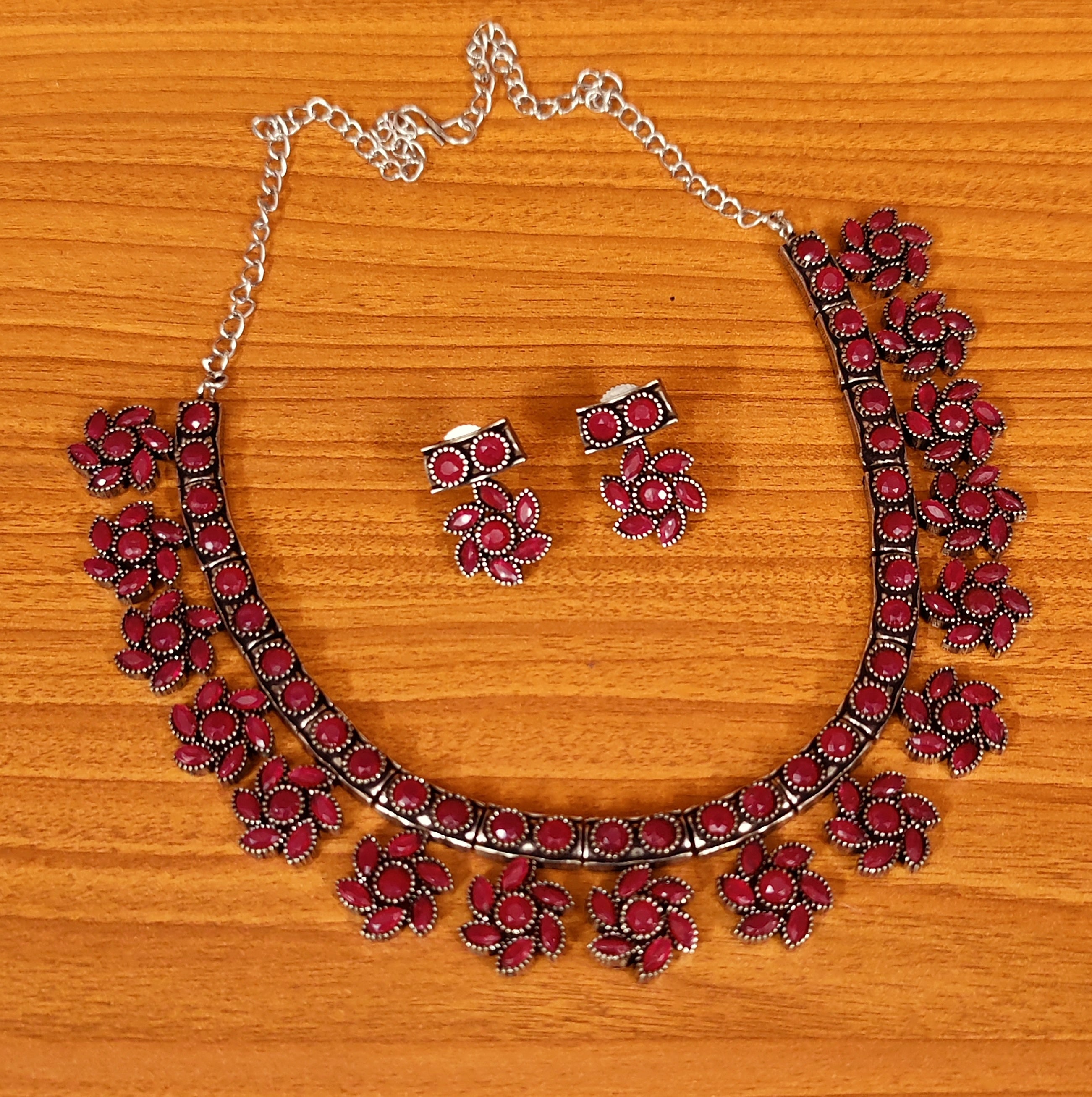 RUBY COLOUR FLOWER PATTERN OXIDISED SILVER NECKLACE SET