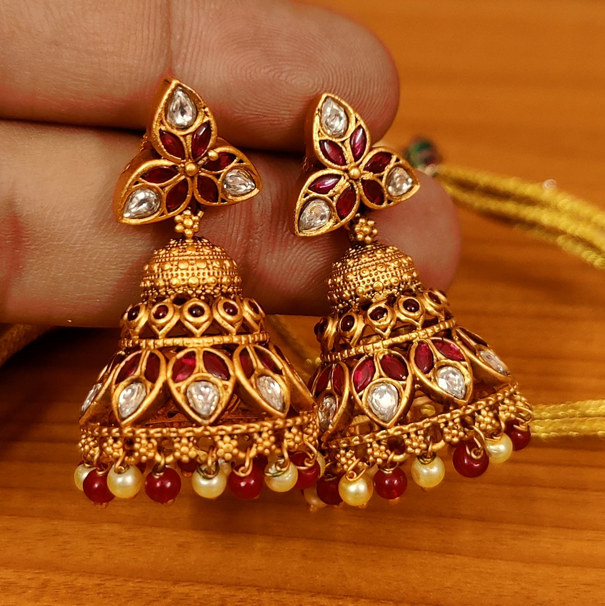 This beautiful ruby choker set is handcrafted in silver alloy with red colour kempu stones, pearls and kundan stones of very fine quality. This gorgeous necklace set is plated with fine 22kt nickle free matt gold rhodium that gives the design a real gold look . The necklace comes with a matching pair of jhumka's which are absolutely gorgeous and are very light in weight.