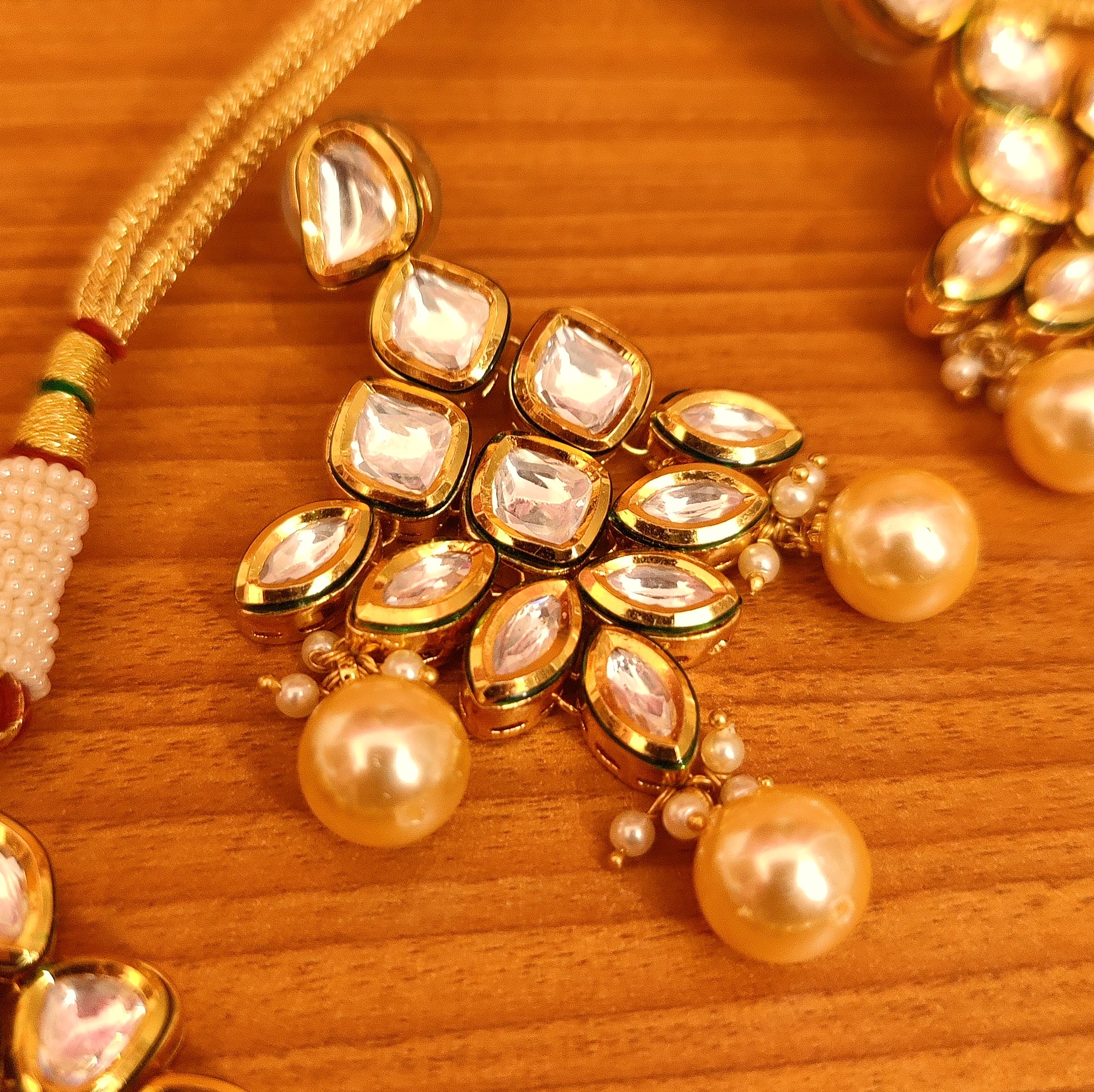 This beautiful necklace set is handcrafted in brass alloy with imitation pearls & kundan with meenakari work of very fine quality . this necklace set is coated with 18 kt gold polish which give them a unique look . an absolutely stunning piece to own and are very light in weight.