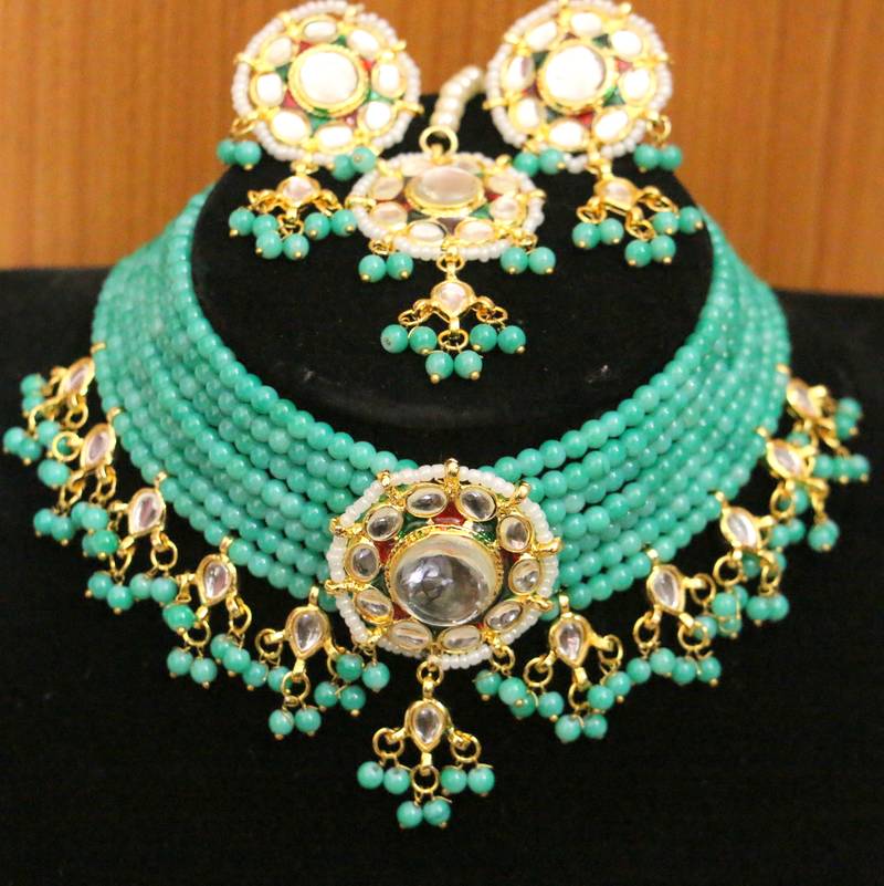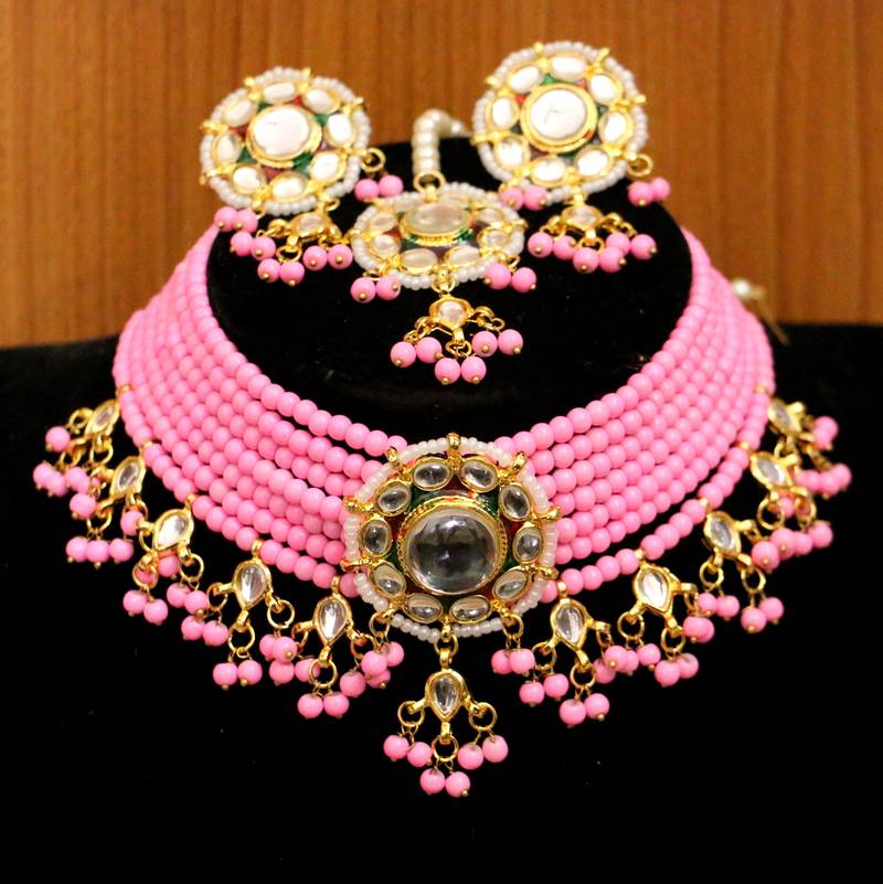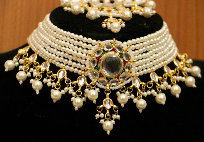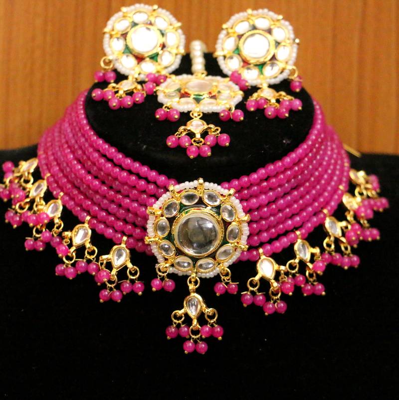 This Kundan Polki Choker Necklace Set Is Handcrafted In Silver Alloy With Imitation White Colour Glass Beads And Kundan Polki Stones Of Fine Quality , The Necklace Set Is Plated In 18kt Gold Plating And The Design Itself Is Perfect For Wedding Attires.