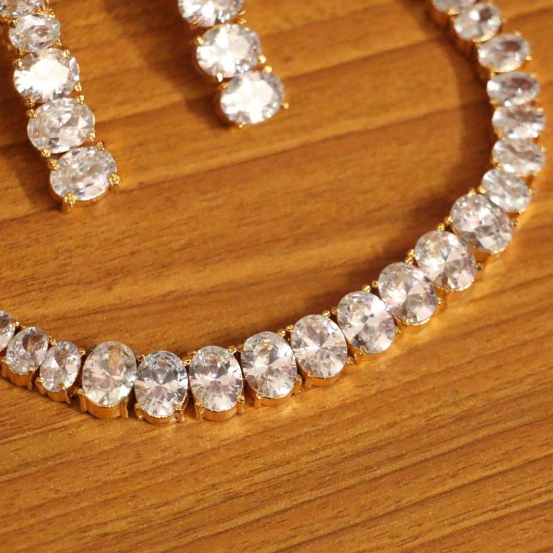 This Diamond Look Oval Shaped Cz Necklace Set Is Handcrafted In Silver Alloy With Imitation Cz Stones Of Very Fine Quality . His Necklace Set Is Coated With 18kt Gold Rhodium Plating That Gives A Real Gold Look . An Absolutely Stunning Piece To Own And Are Light In Weight.