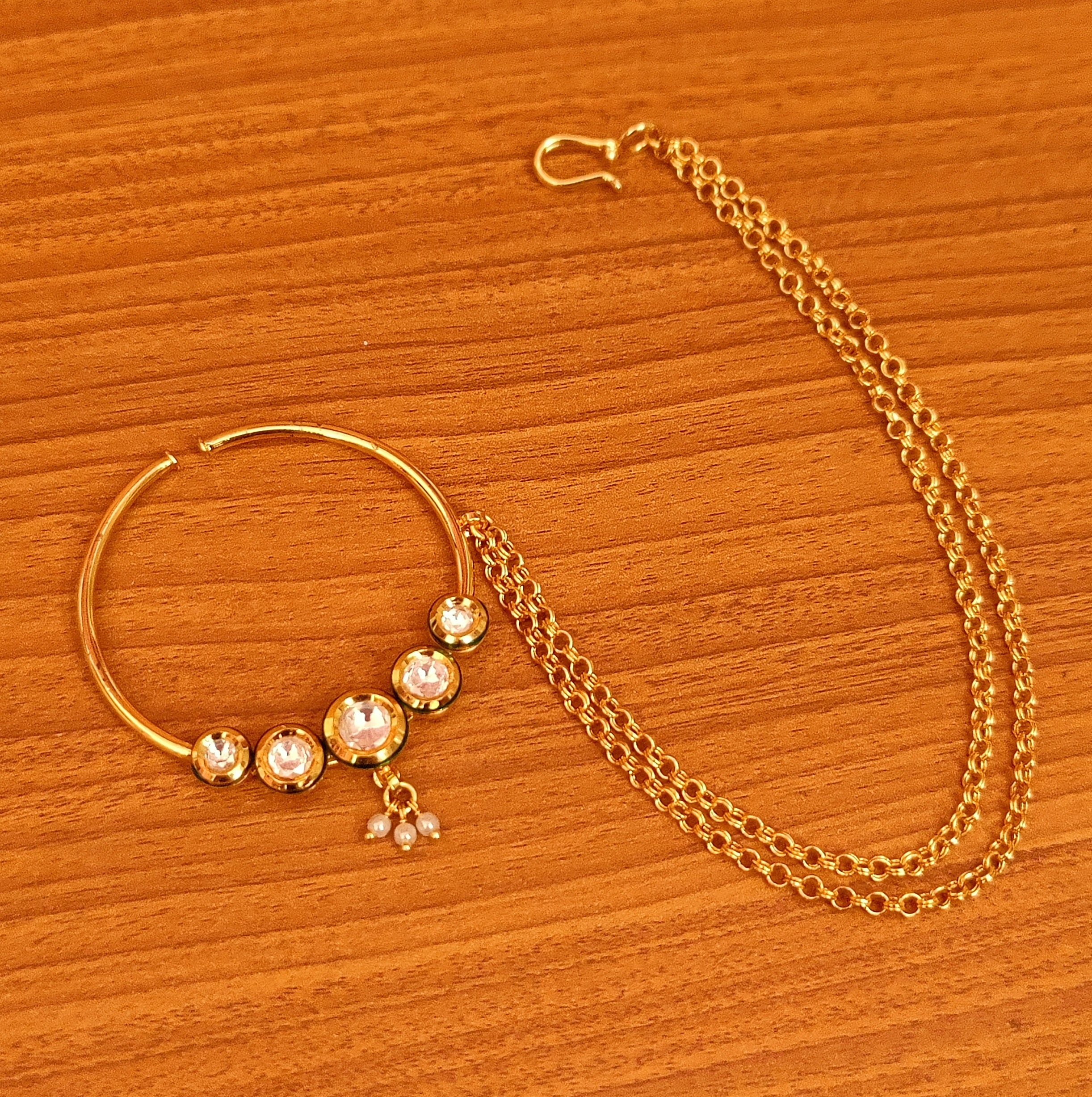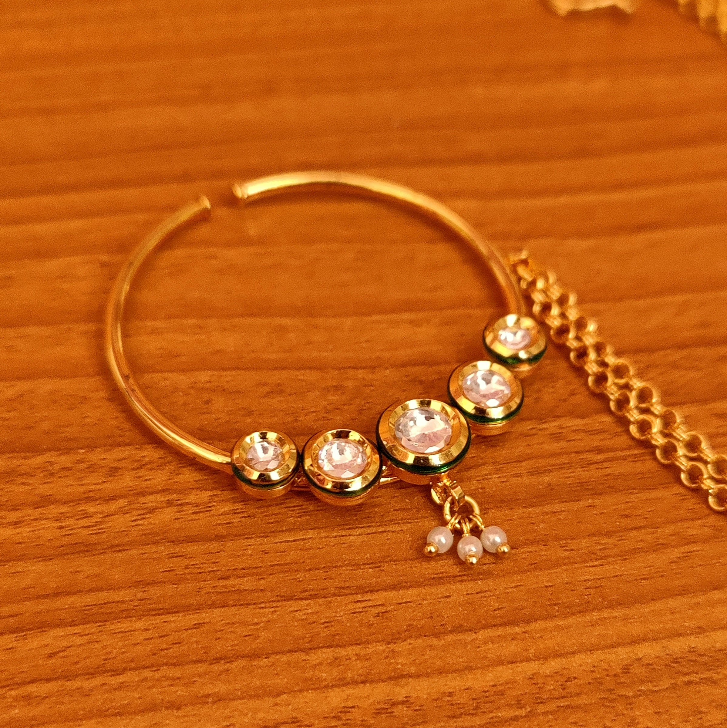 This beautiful nose ring is handcrafted in brass alloy with imitation pearls and kundan with meenakari work of very fine quality . this nose ring is coated with 18 kt gold polish which give it a real look . an absolutely stunning piece to own and is very light in weight.