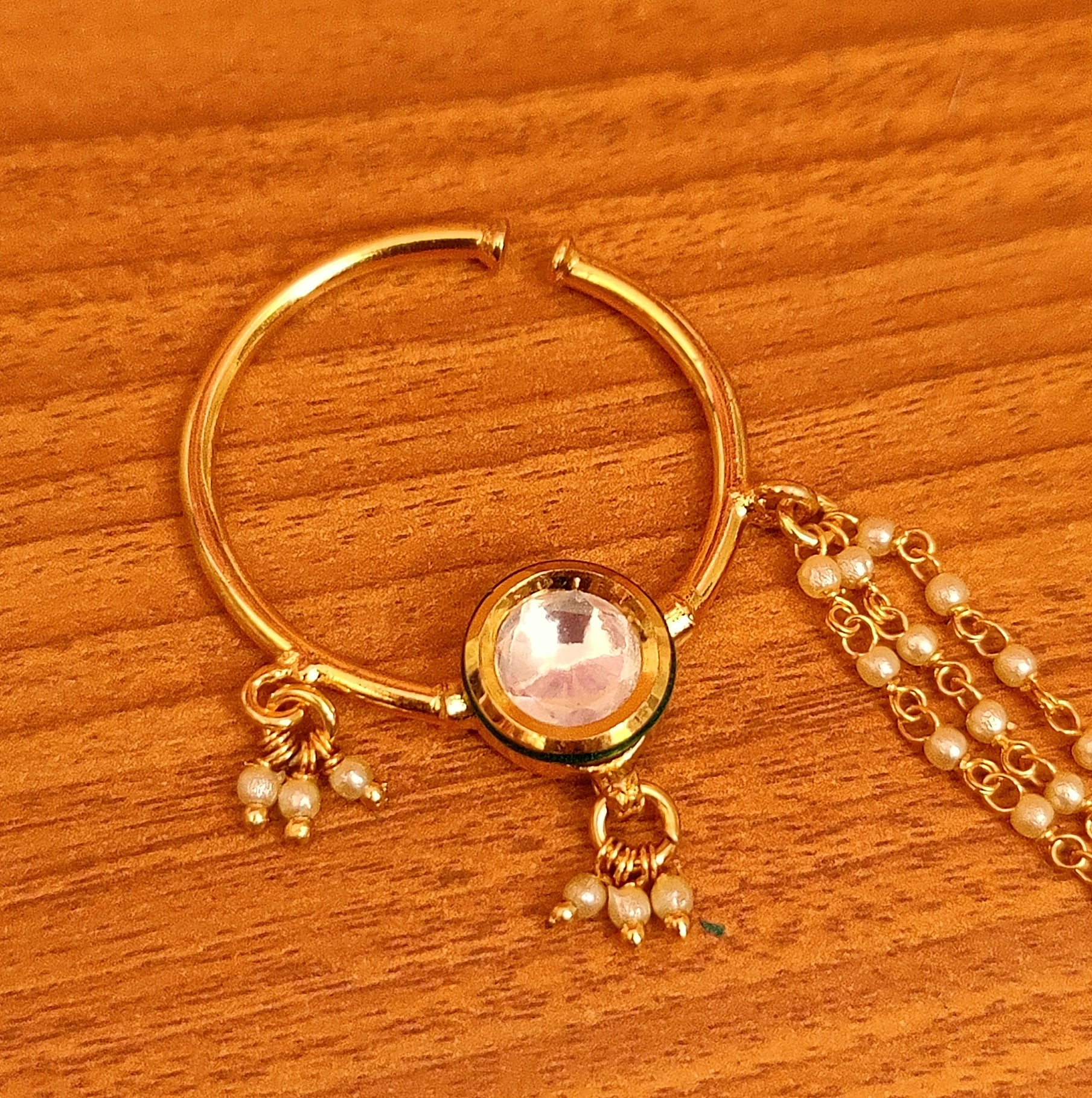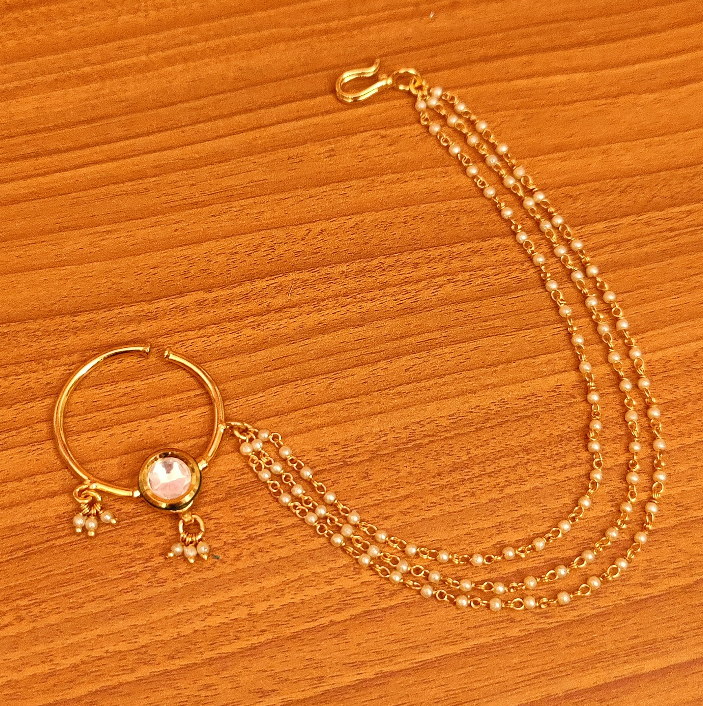This beautiful nose ring is handcrafted in brass alloy with imitation semi precious pearls chain & kundan work of very fine quality . this nose ring is coated with 18 kt gold polish which give it a real look . an absolutely stunning piece to own and is very light in weight.