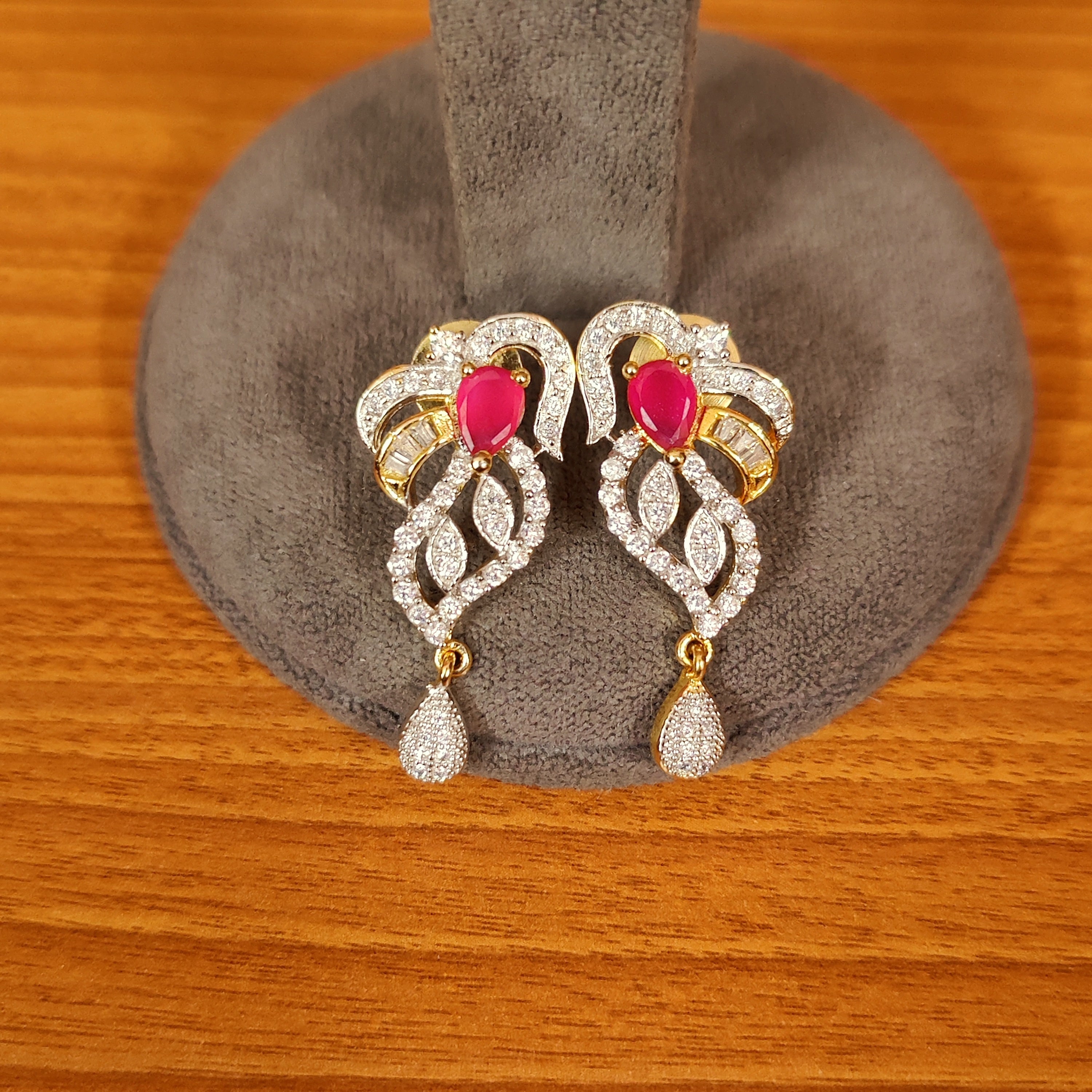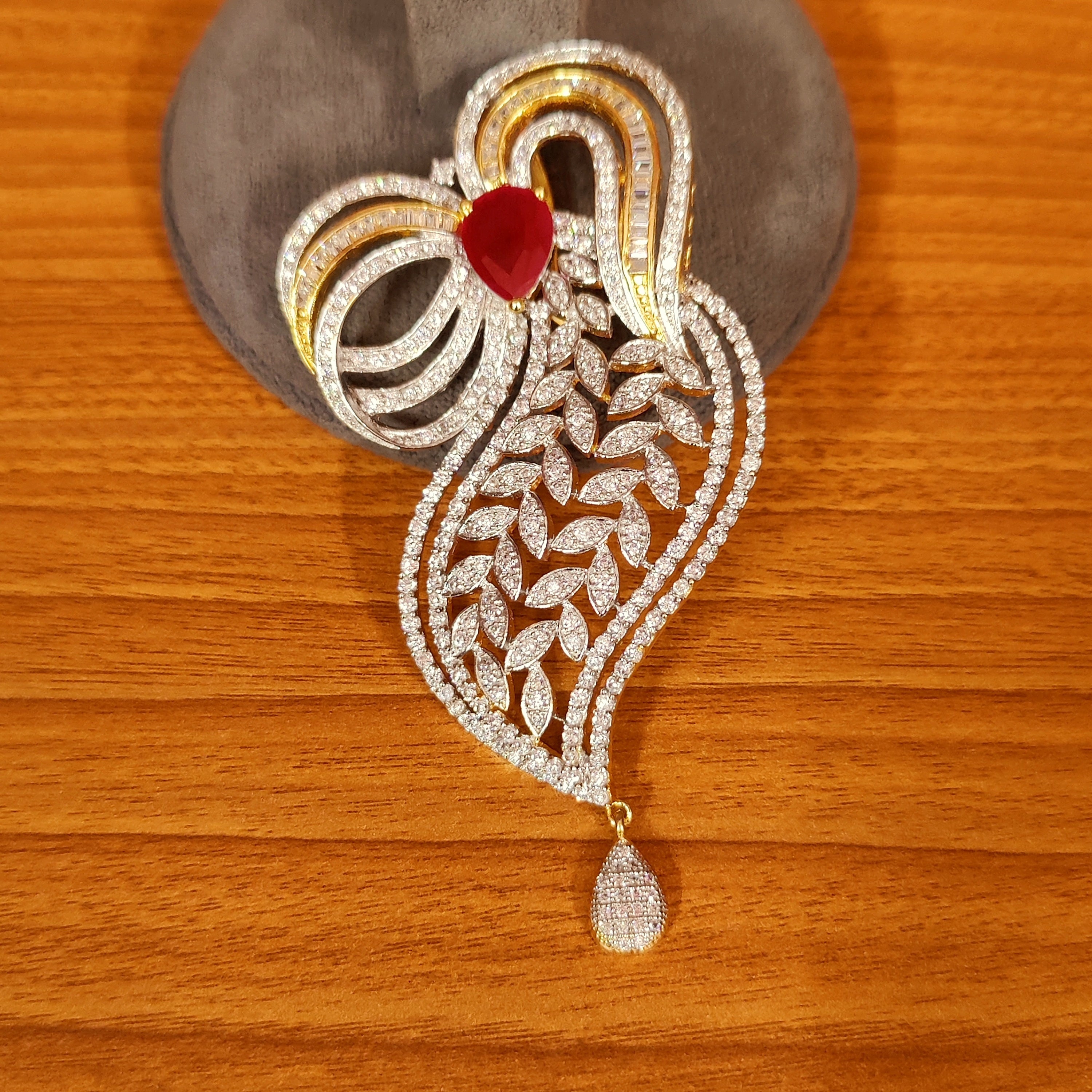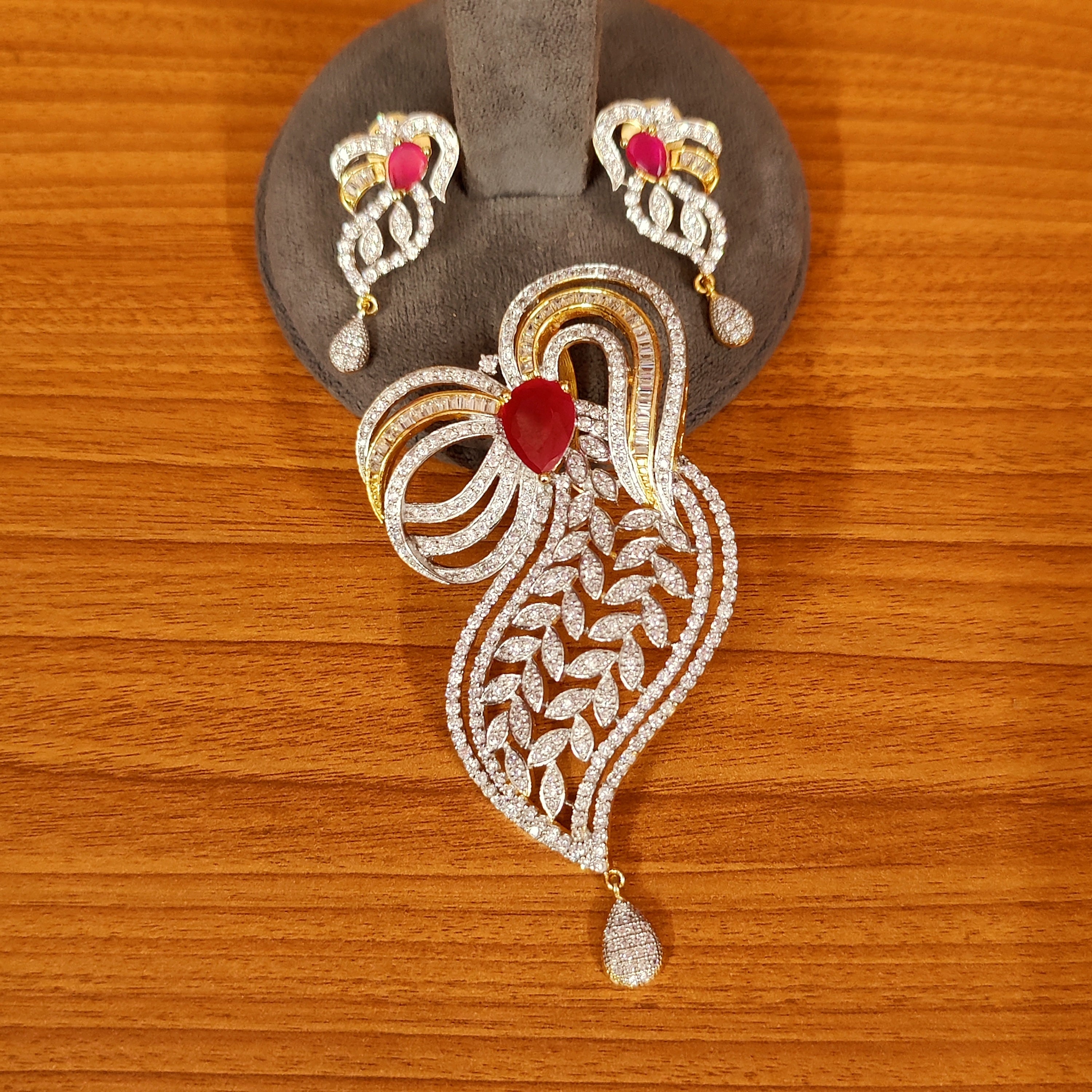 This diamond look pendant set is made in silver alloy with imitation red ruby stone and american diamond stones of extremely fine quality. This gorgeous pendant set is handcrafted to perfection with superior quality coloured & cz stones and is plated with 18kt nickle free gold rhodium that gives the design a real diamond look & comes with a matching pair of medium size earrings which are absolutely gorgeous and are very light in weight.