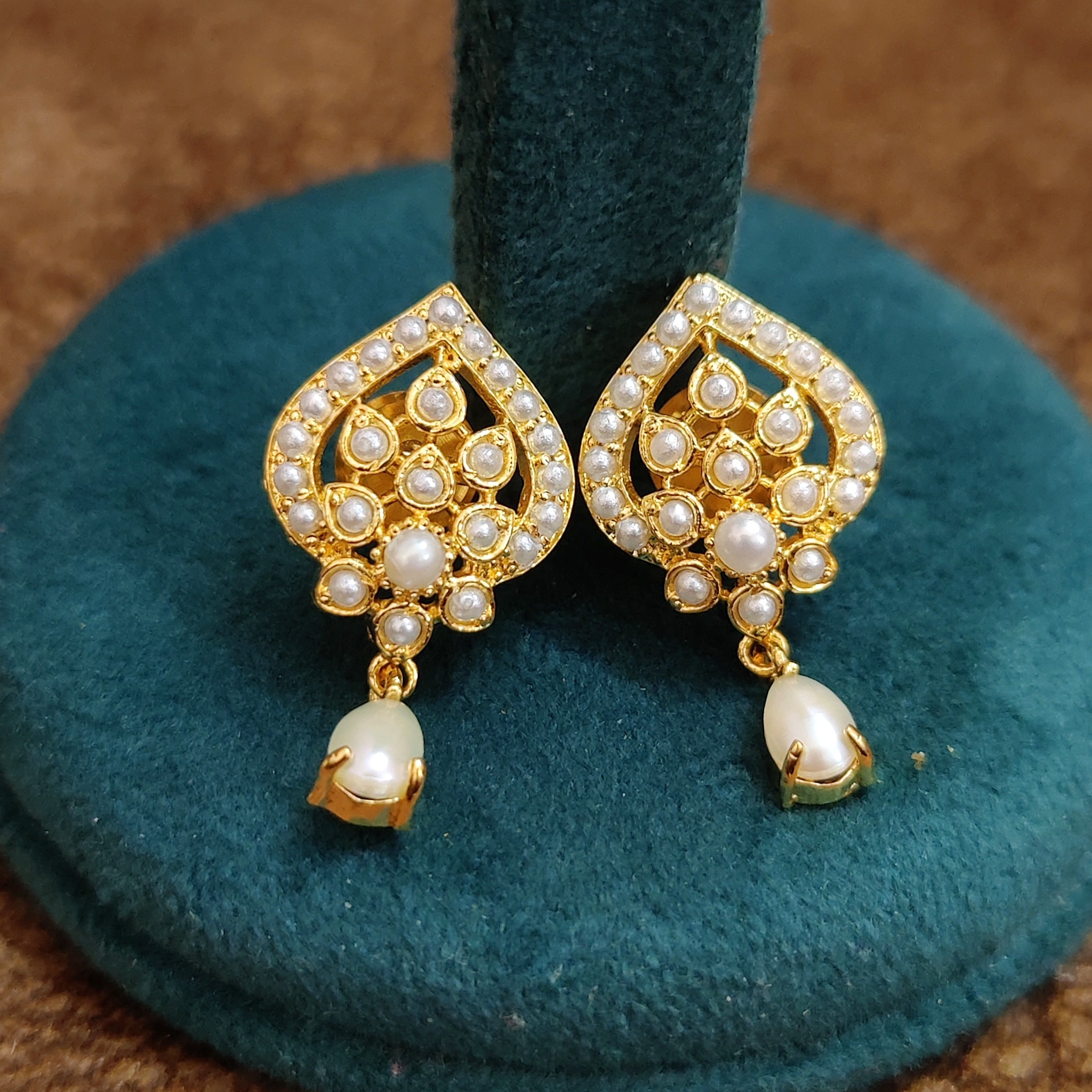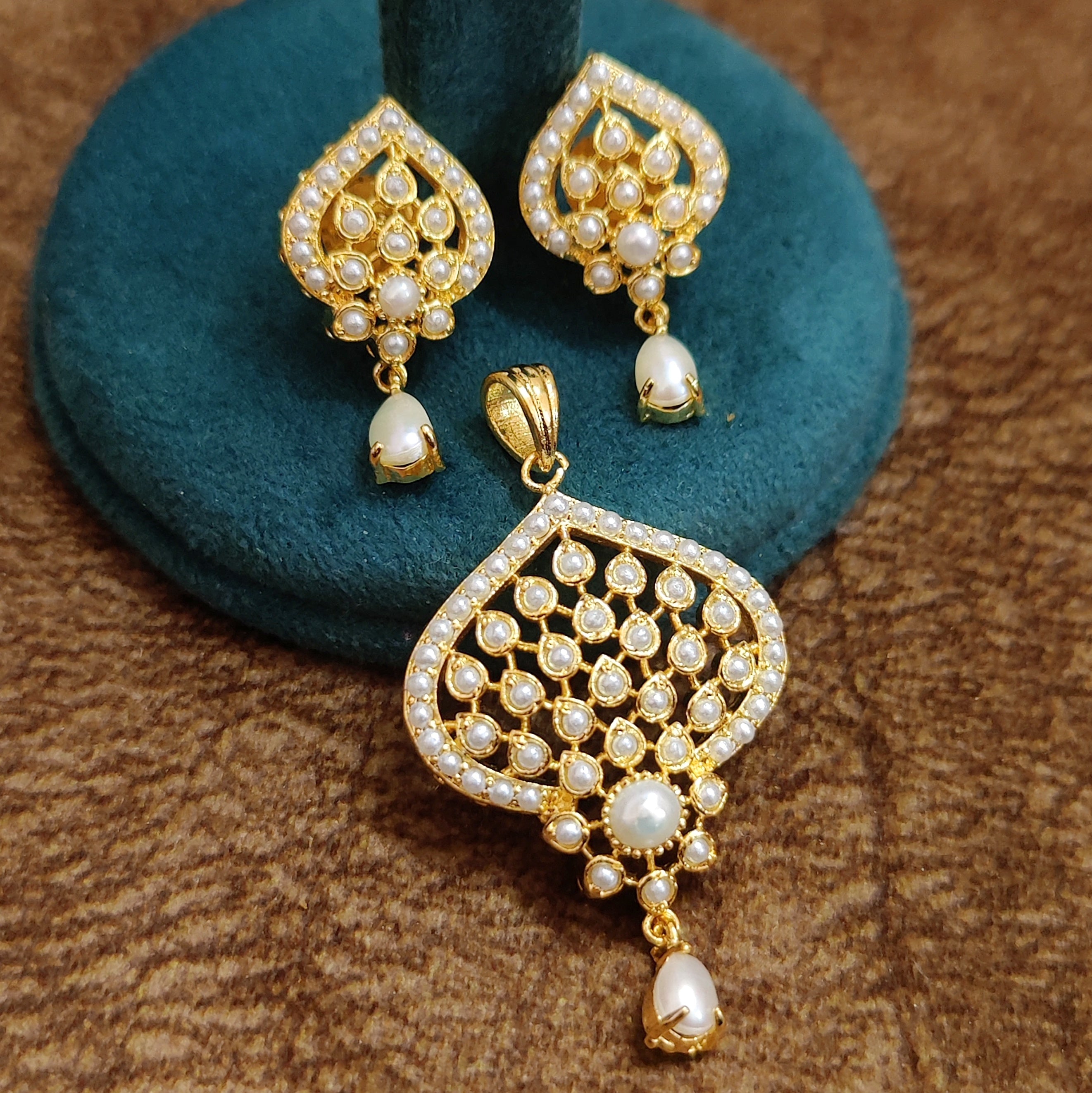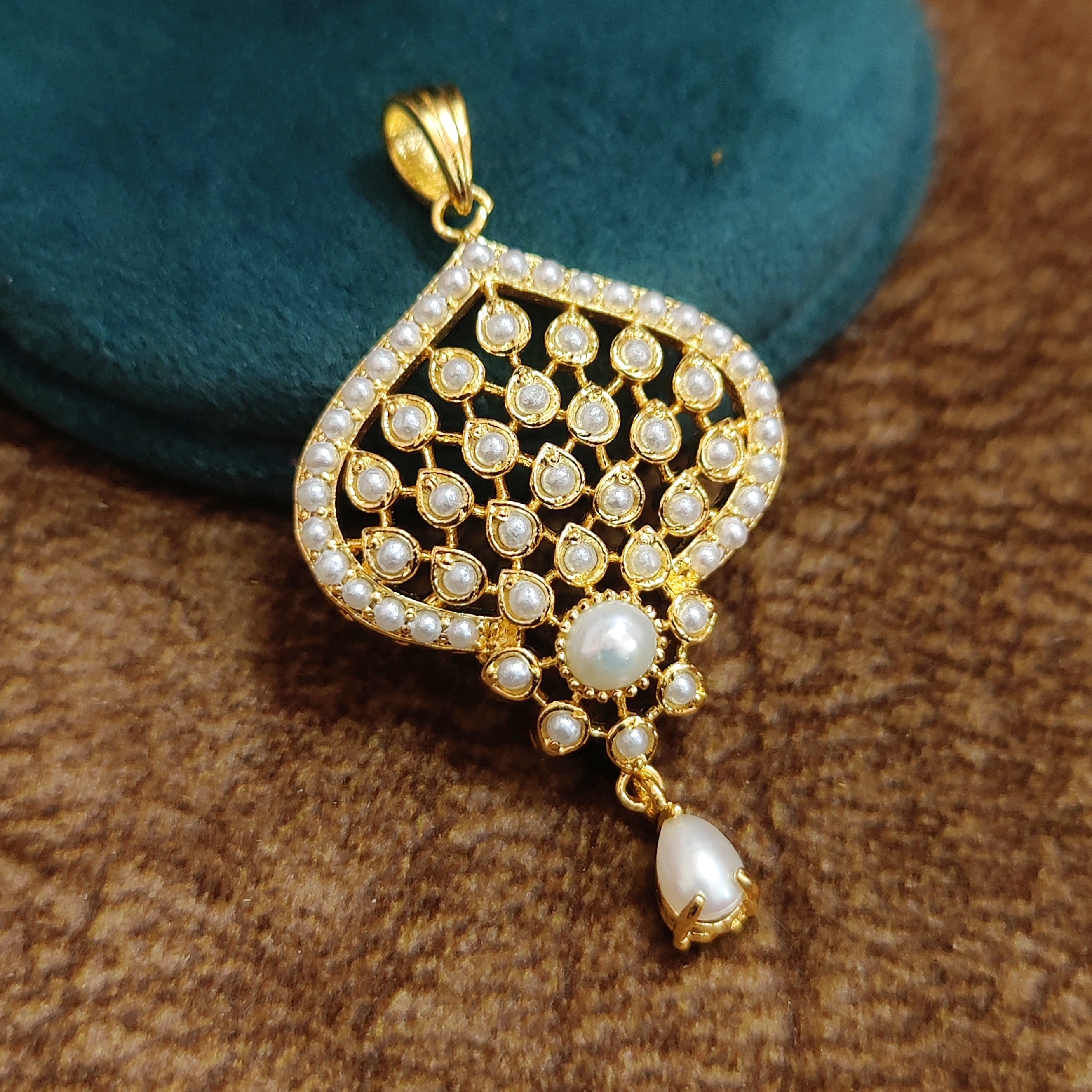 Turn every head at weddings, parties, or festive celebrations with this exquisitely designed Gold-Plated Pearl Pendant Set. The teardrop-shaped lattice, embellished with sparkling cubic zirconia and luminous pearls, adds a regal charm to your look.
