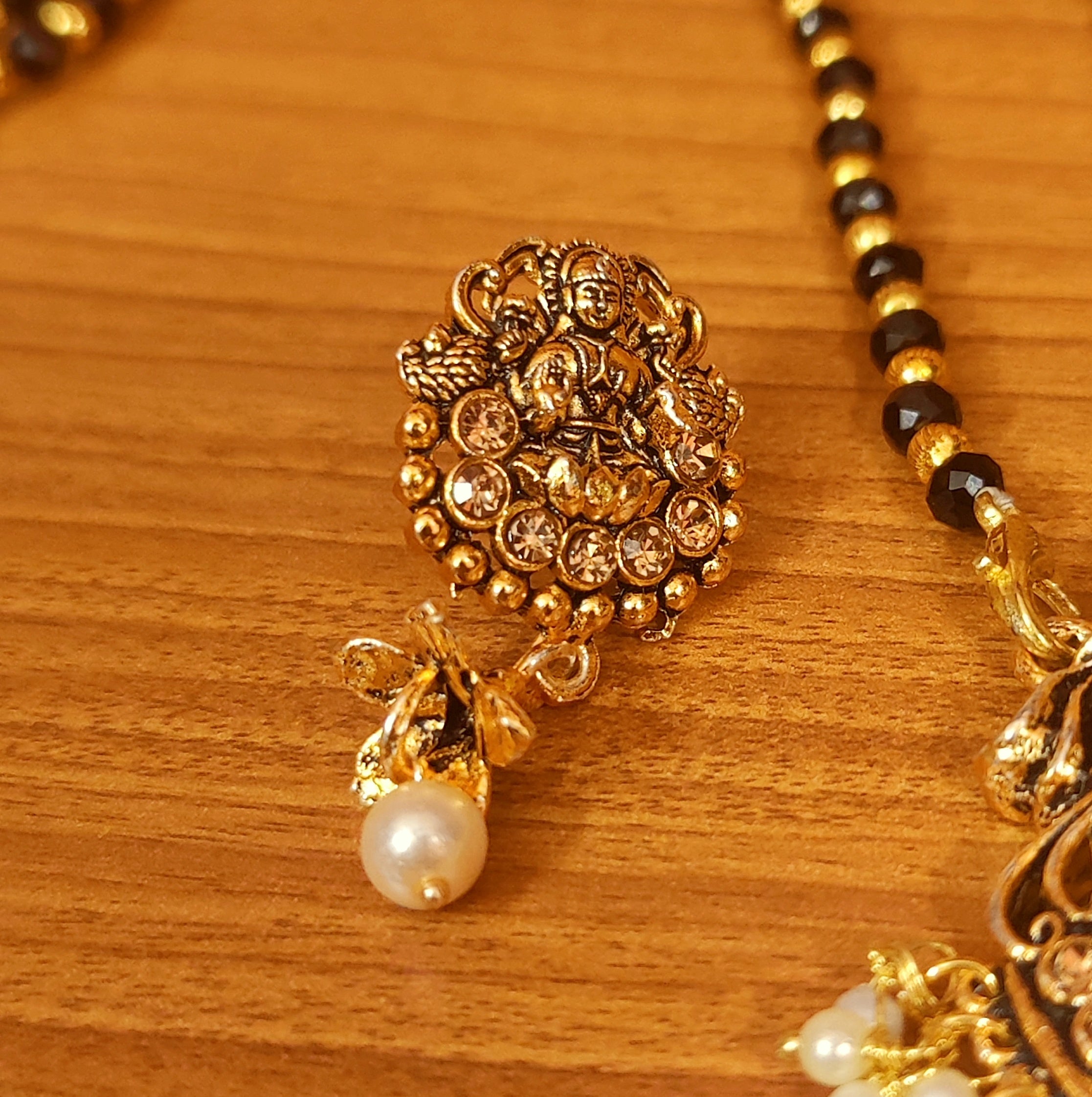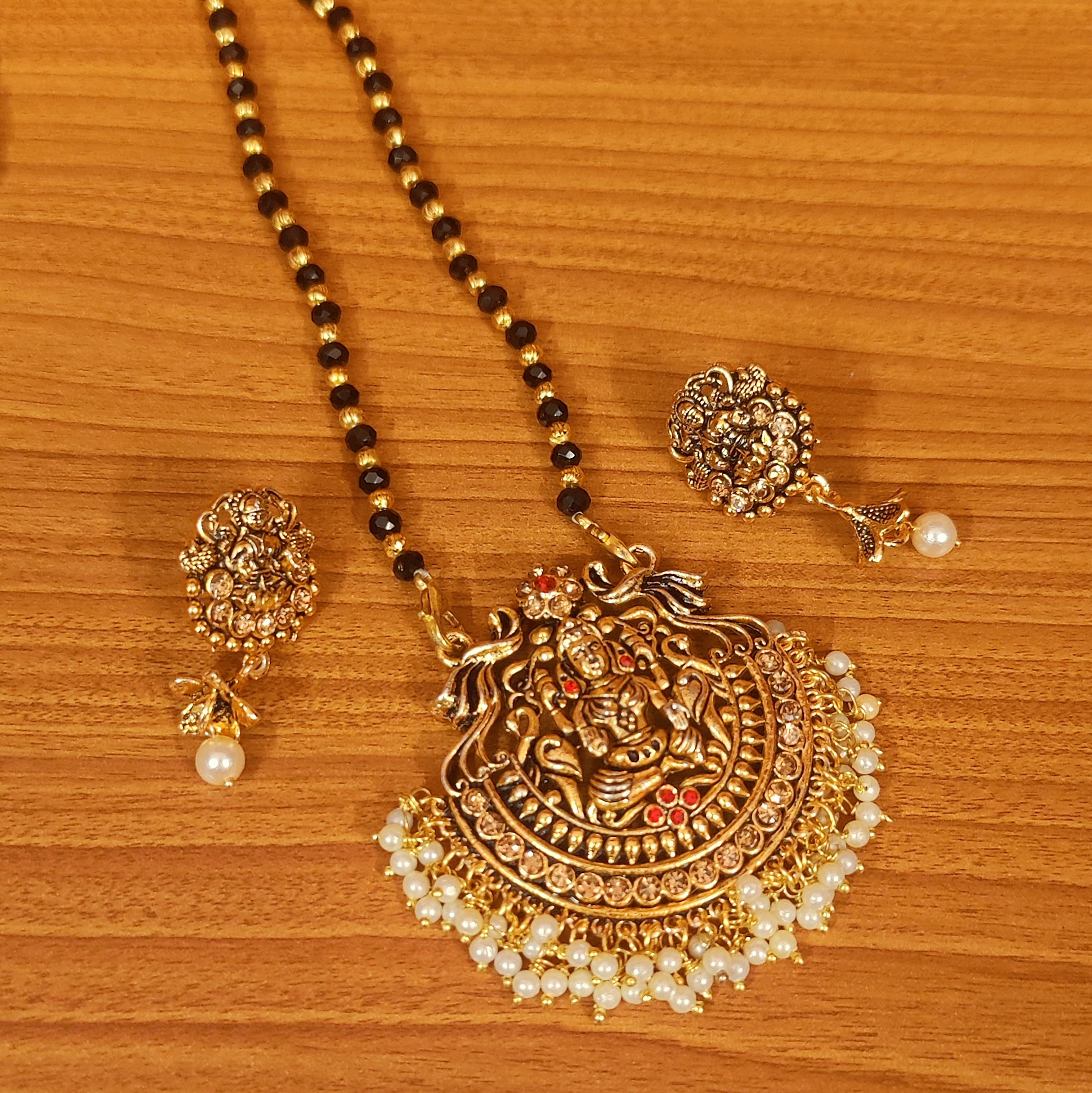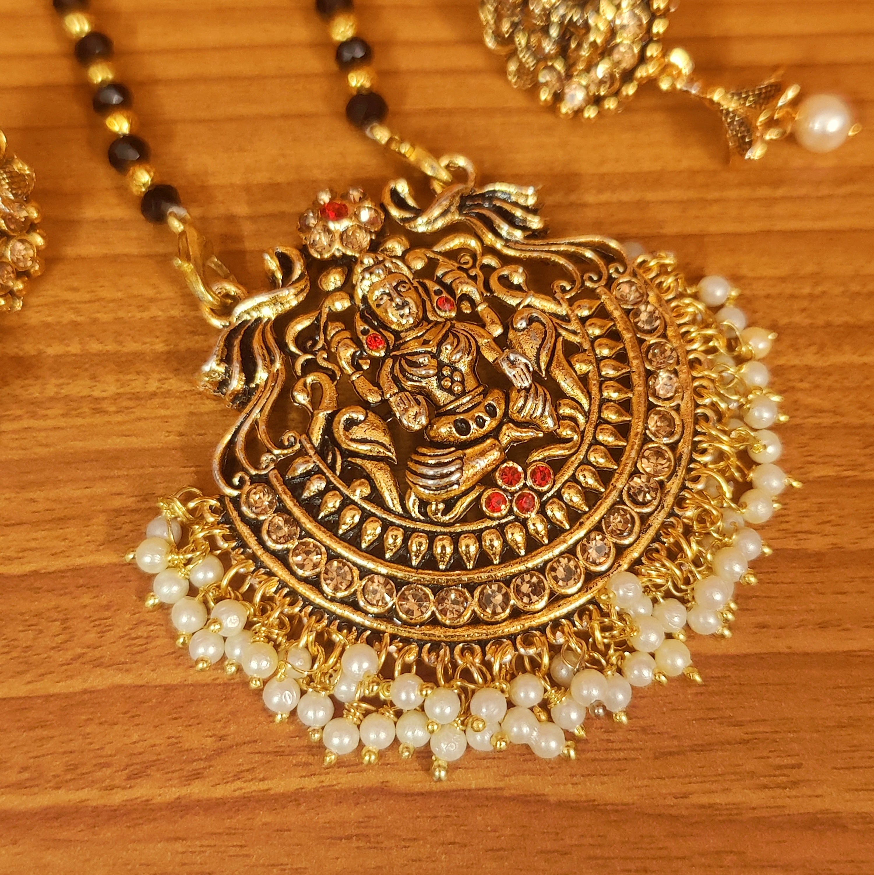 This temple look pendant set is handcrafted in copper alloy with imitation black & gold beads & imitation pearls of very fine quality. This beautiful pendant set is plated with fine 18kt nickle free antique gold rhodium that gives a real gold look to the design and comes with a pair of matching small earrings which are very light in weight.