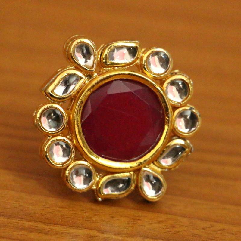 RUBY COLOUR GOLD PLATED KUNDAN POLKI RING