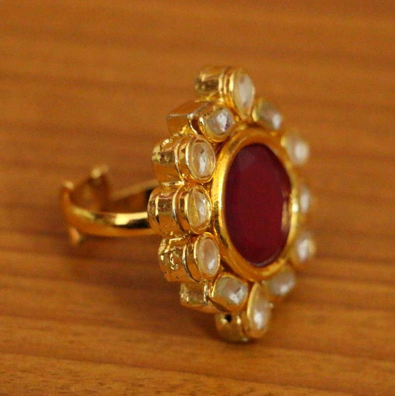 This Kundan Polki Ring Is Handcarfted In Brass Alloy With Imitation Ruby Colour Of Very Fine Quality , The Ring Is Light In Weight And Plated With 18kt Gold Rhodium To Give It A Real Gold Look.