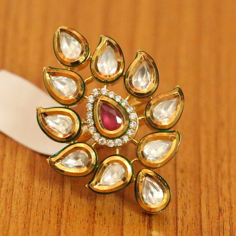 This beautiful ring is handcrafted in brass alloy with imitation ruby & kundan with meenakari work of very fine quality . This ring is coated with 18 kt gold polish which give them a unique look . An absolutely stunning piece to own and are very light in weight.