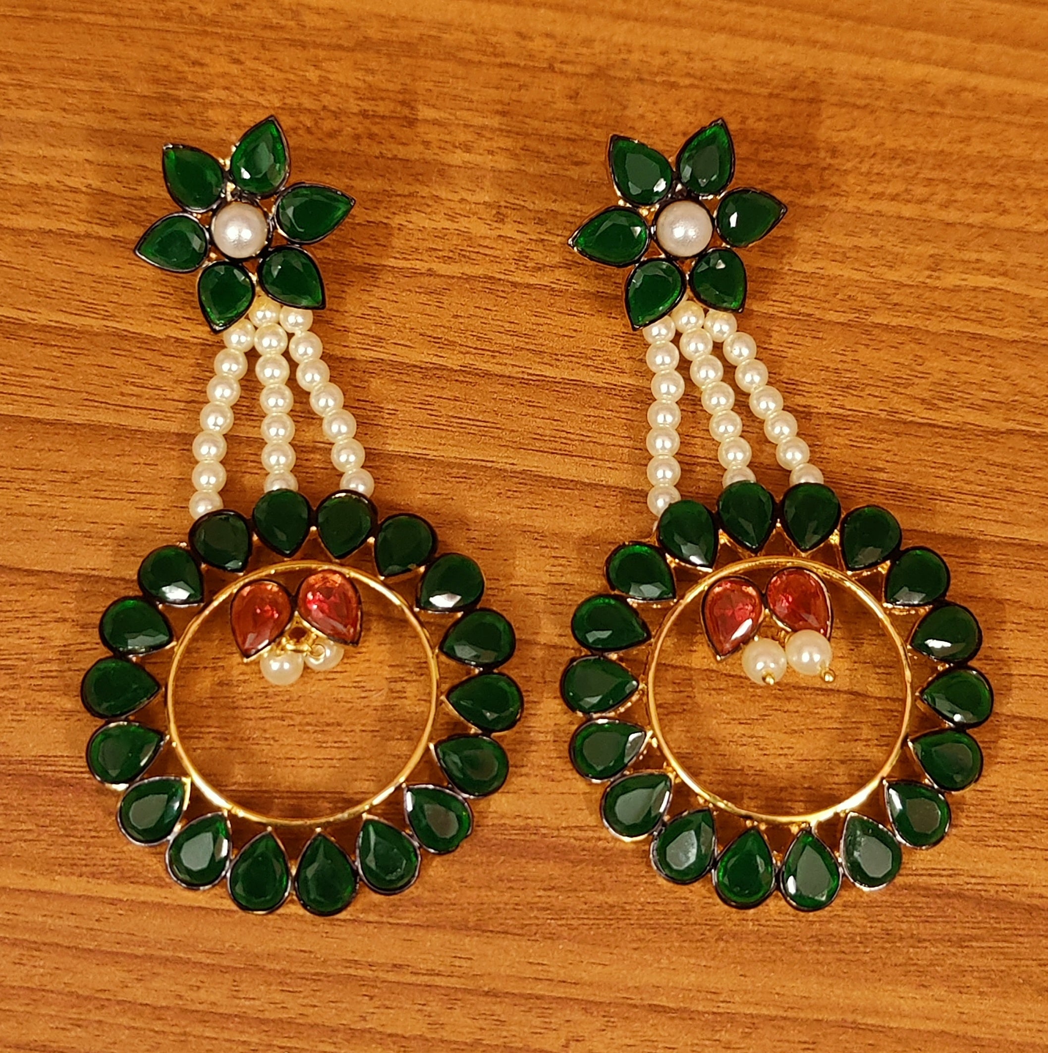 These multicolour earrings are handcrafted in copper alloy with imitation red & green colour quartz stones & pearls of very fine quality. These earrings are plated with 18kt gold rhodium and are very light in weight.