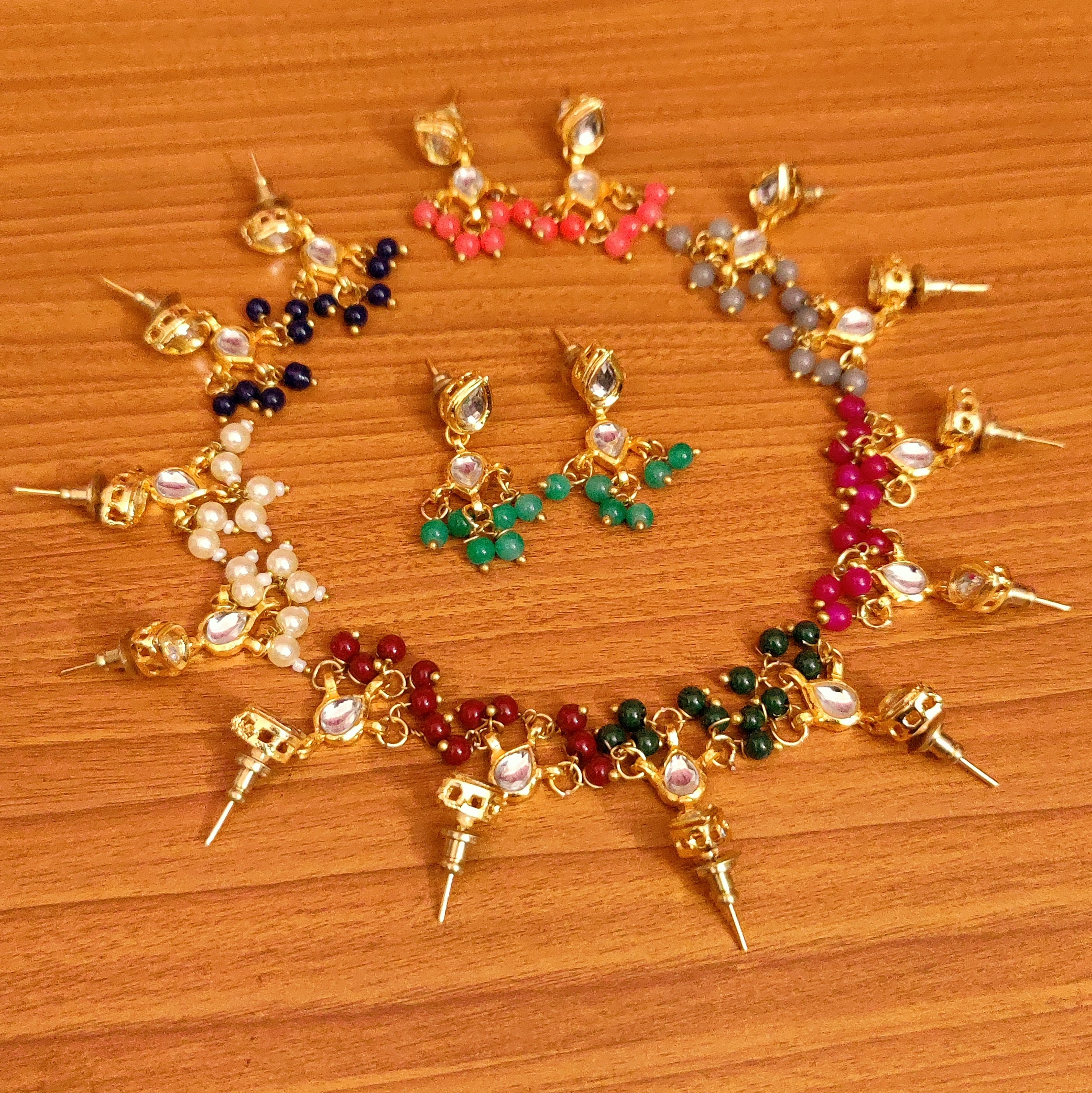 These kundan polki studs are handcrafted in brass alloy with imitation multi colour pearls of very fine quality. these artistic yet modern studs are plated with high quality gold rhodium. the earrings are very light in weight.