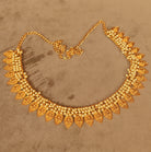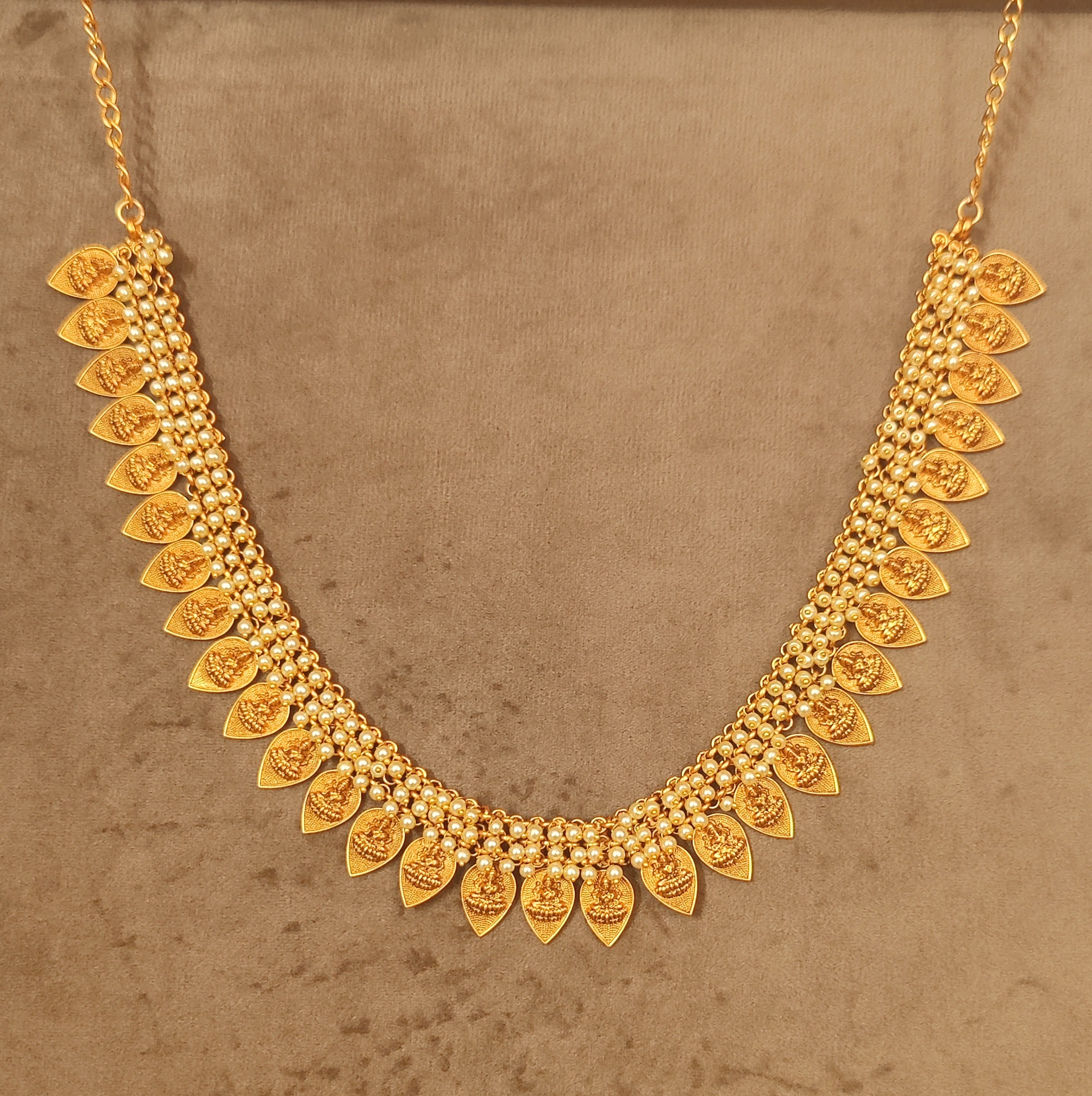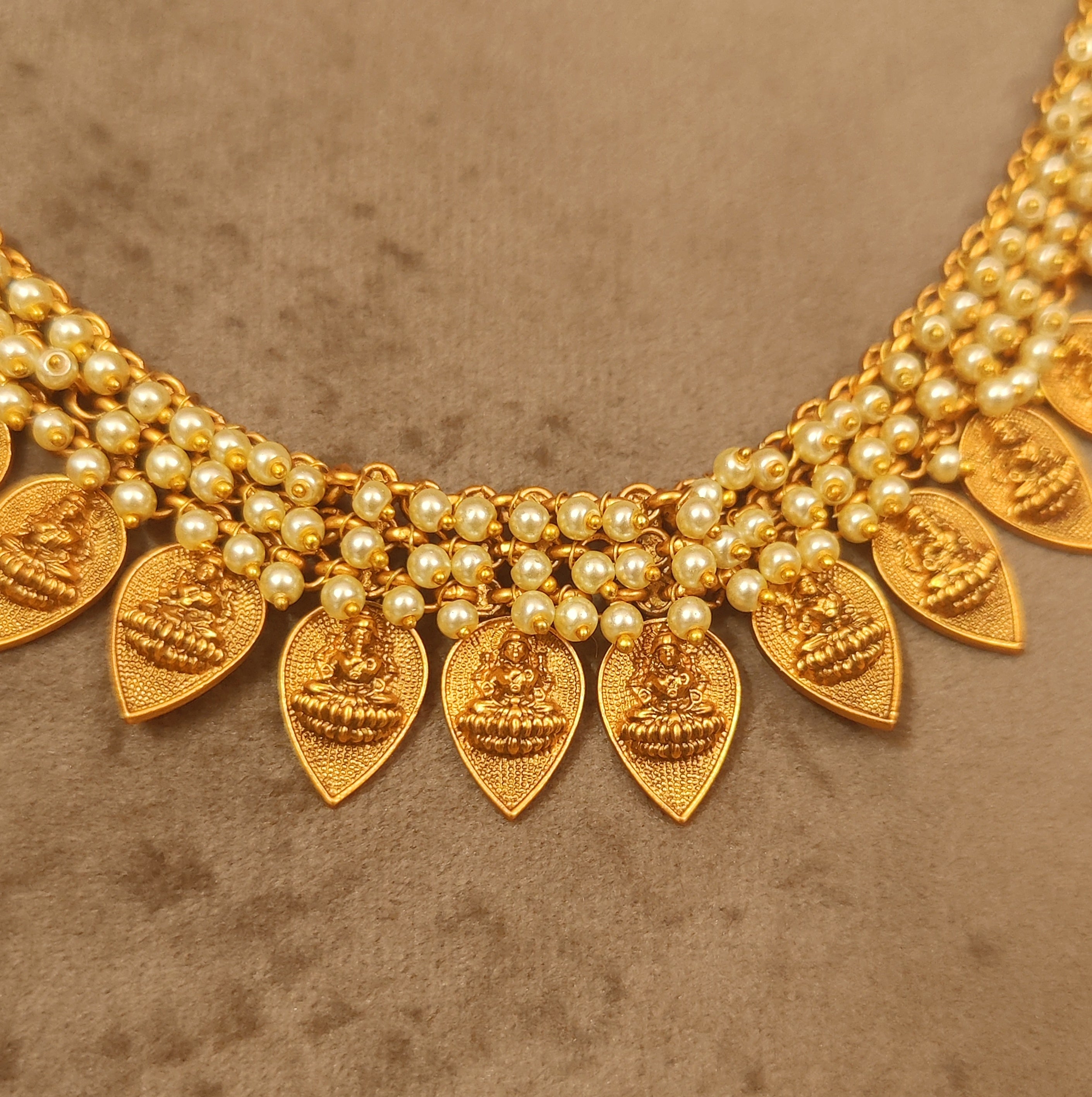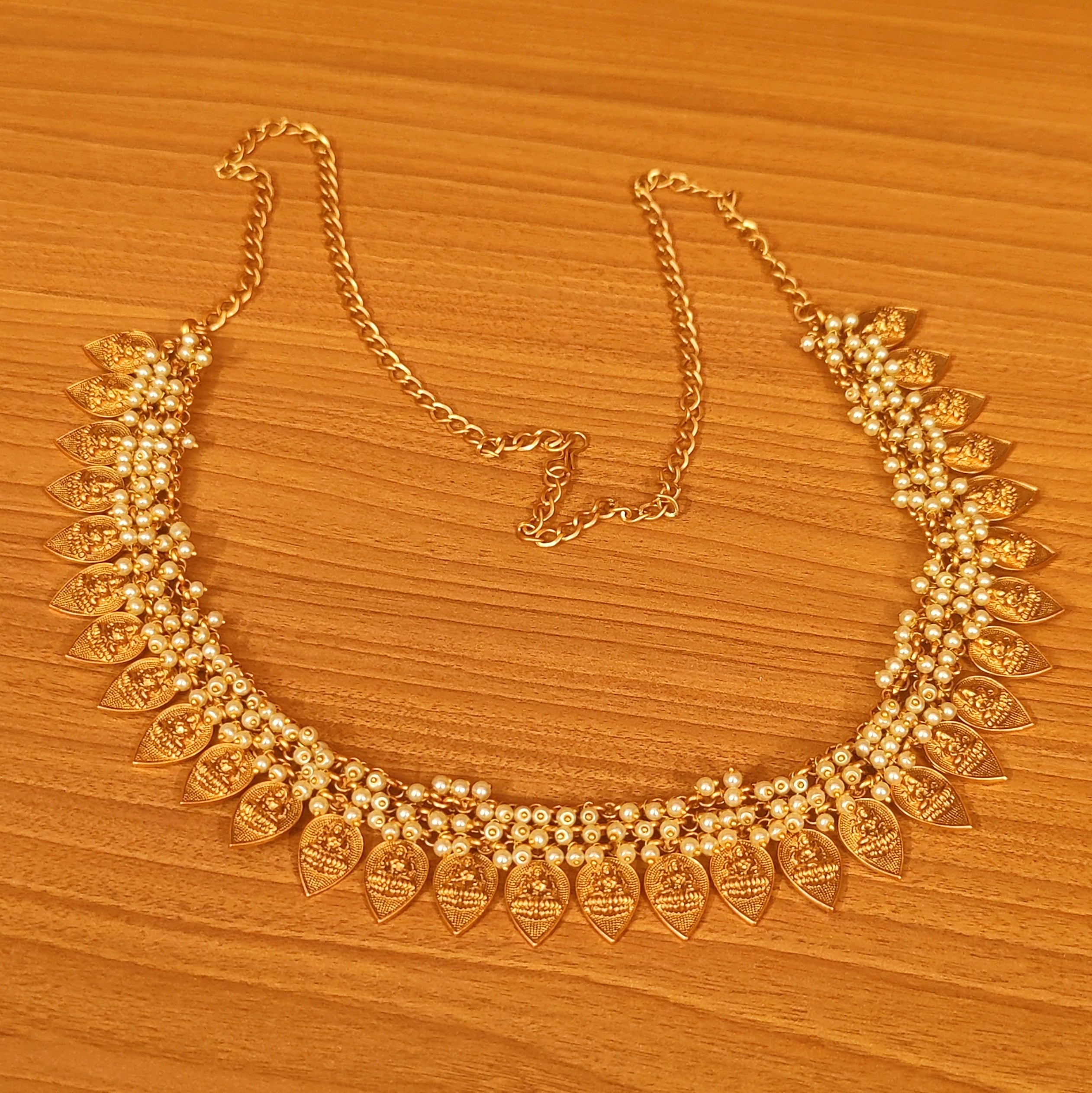 This temple look waist belt is handcrafted in copper alloy with intricately carved goddess lakshmi figure on a leaf pattern gold motif and pearls of very fine quality. This waistbelt is plated with 22kt antique nickle free antique gold rhodium that gives a real gold look to the design, the waistbelt is adjustable and have a chain attached to the both sides and the plating is extremely good quality and will last for years.
