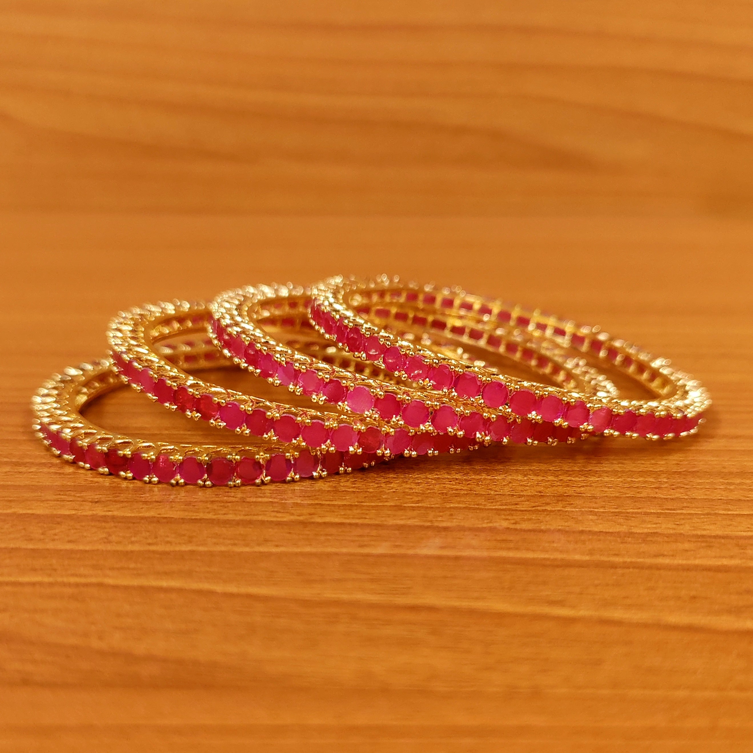 These beautiful bangles are handcrafted in silver alloy with imitation red colour quartz stone & american diamond stones of very fine quality. These single line bangles are coated with 18 kt gold plating that gives a real look to the design and comes as a set of 4 bangles.