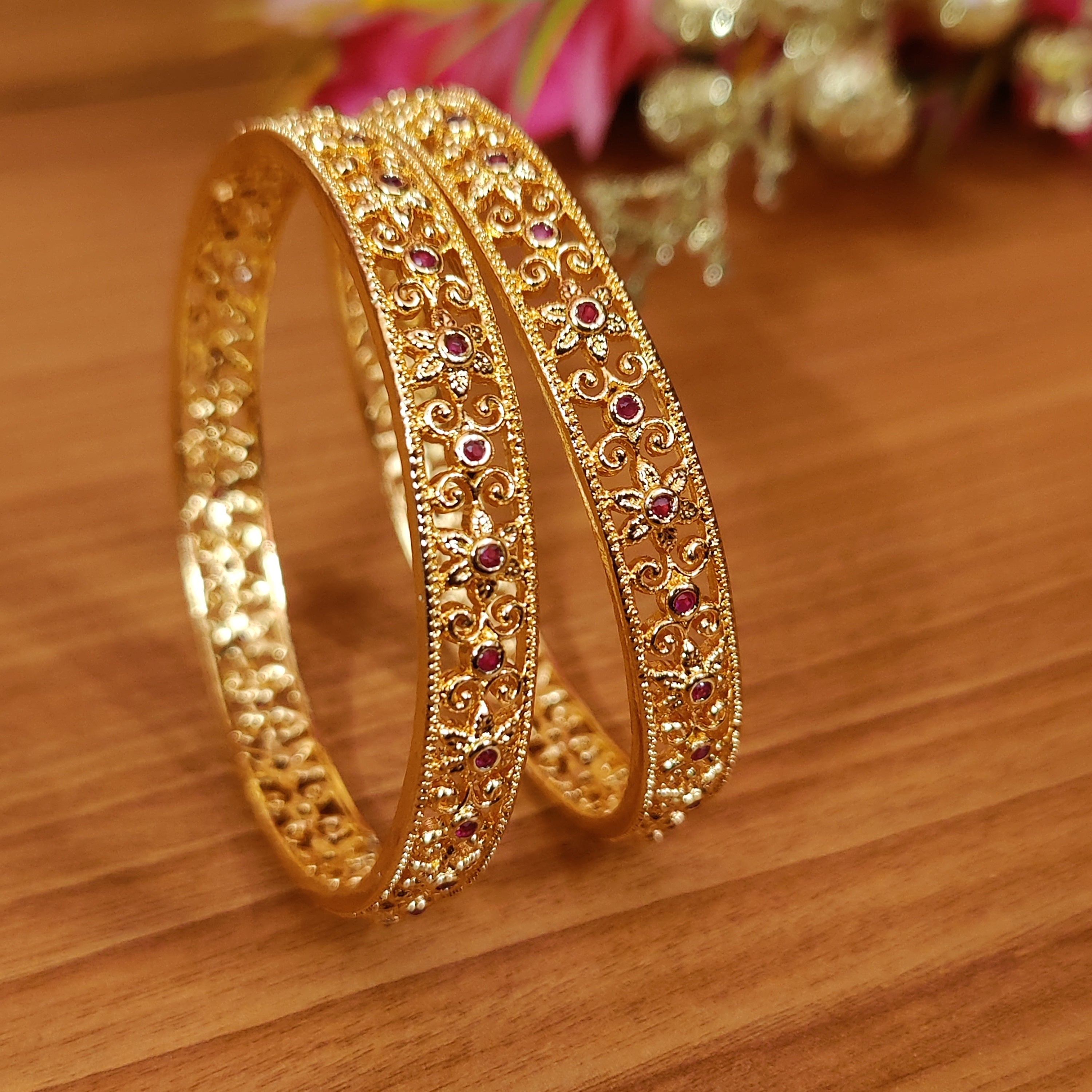 This set of gold plated bangles features stunning ruby colour stones, adding a touch of glamour to any outfit. The lightweight design and fine craftsmanship make them comfortable to wear, while the beautiful flower pattern adds an elegant touch. Upgrade your jewelry collection with these exquisite bangles.
