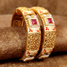 Add a touch of traditional elegance to your jewelry collection with these Gold Finish Meenakari Kundan Openable Bangles from Sanvi Jewels. Featuring intricate Meenakari work and dazzling Kundan stones, these bangles offer the luxurious look of real gold. The openable design ensures easy wear and comfort, making them perfect for weddings, festivals, and special occasions. Elevate your style with these exquisite and versatile bangles.