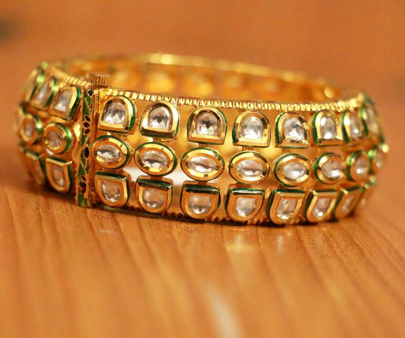 These openable bangles are handcrafted in silver & brass alloy with imitation kundan of very fine quality. These artistic yet modern bangles are plated with fine nickle free gold rhodium to avoid any allergies to the skin.
