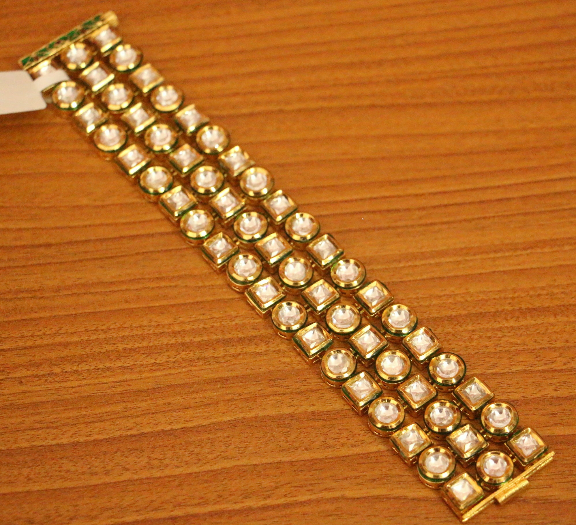 This beautiful bracelets is handcrafted in brass alloy with kundan with meenakari work of fine quality , the bracelets is plated with 18kt nickle free gold plating which gives it a real look .