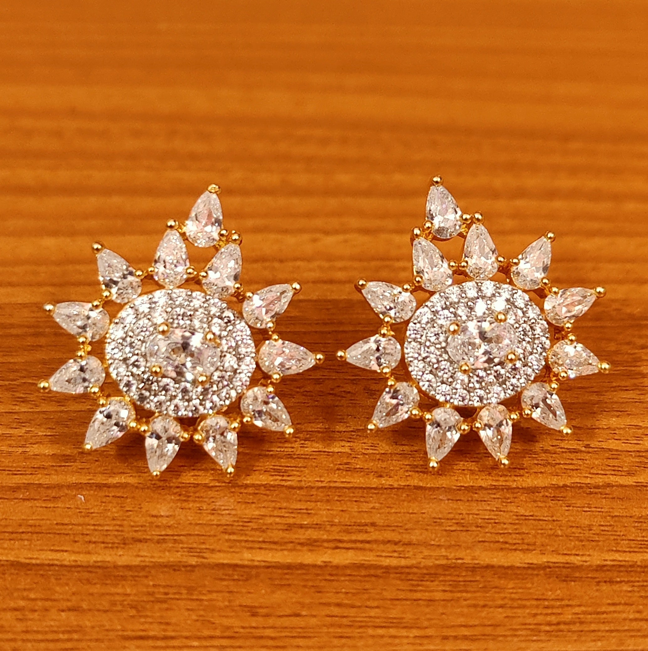 These Studs Are Handcrafted In Silver Alloy With Imitation Blue Zircon & American Diamond Of Very Fine Quality. These Simple Round Pattern Pave Setting Earrings Are Plated With Fine Quality Gold Rhodium. The Earrings Are Very Attractive And Light In Weight.