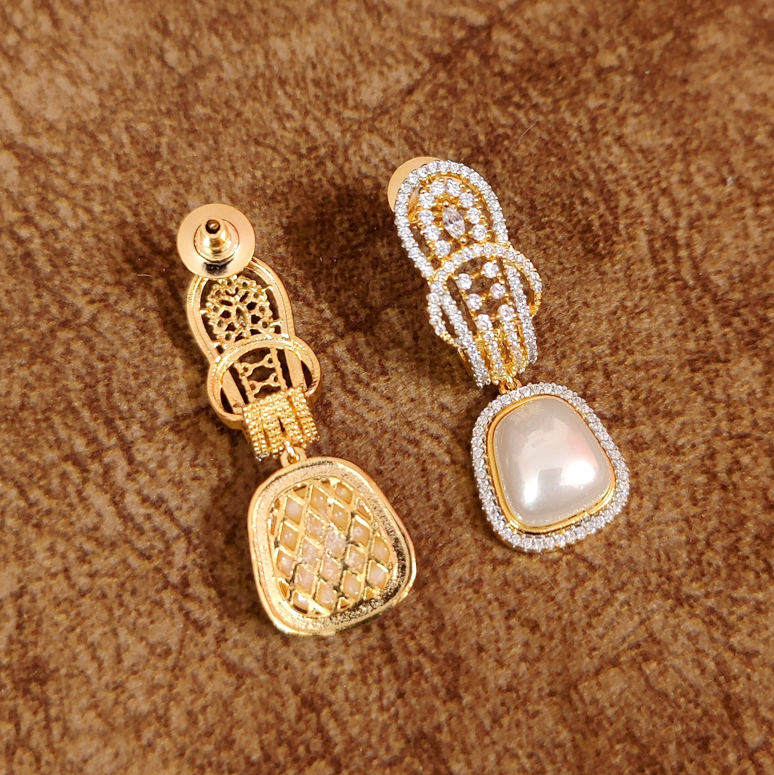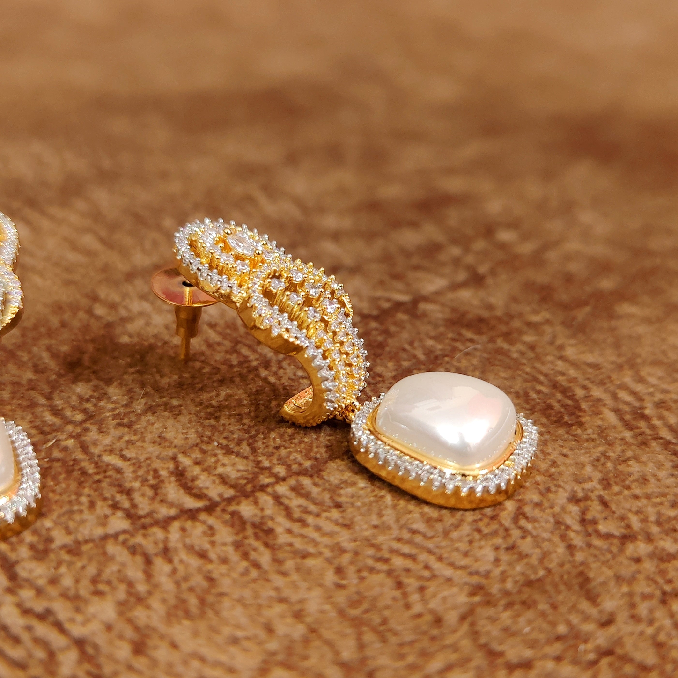 DIAMOND PATTERN GOLD PLATED SHELL PEARL J-HOOP EARRINGS