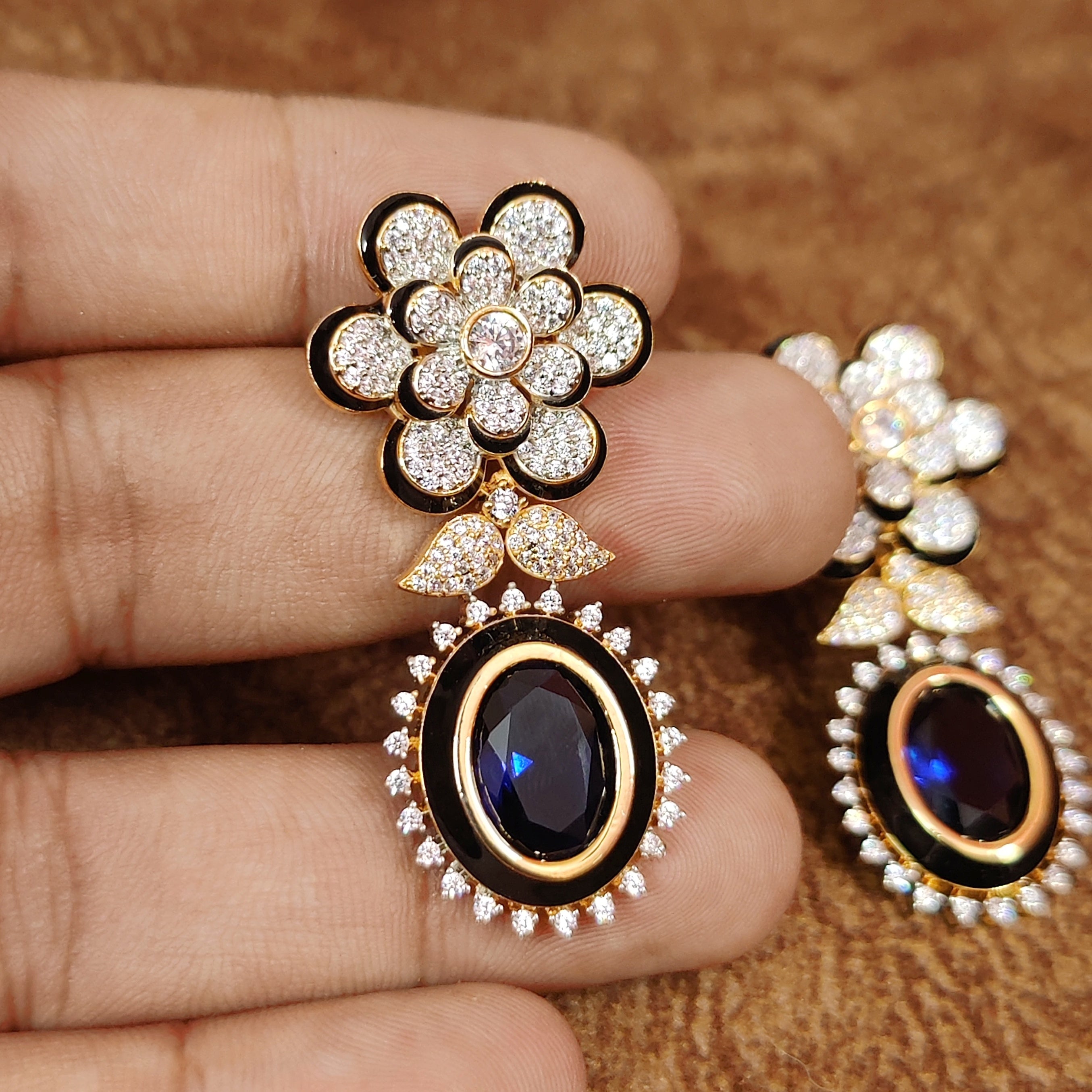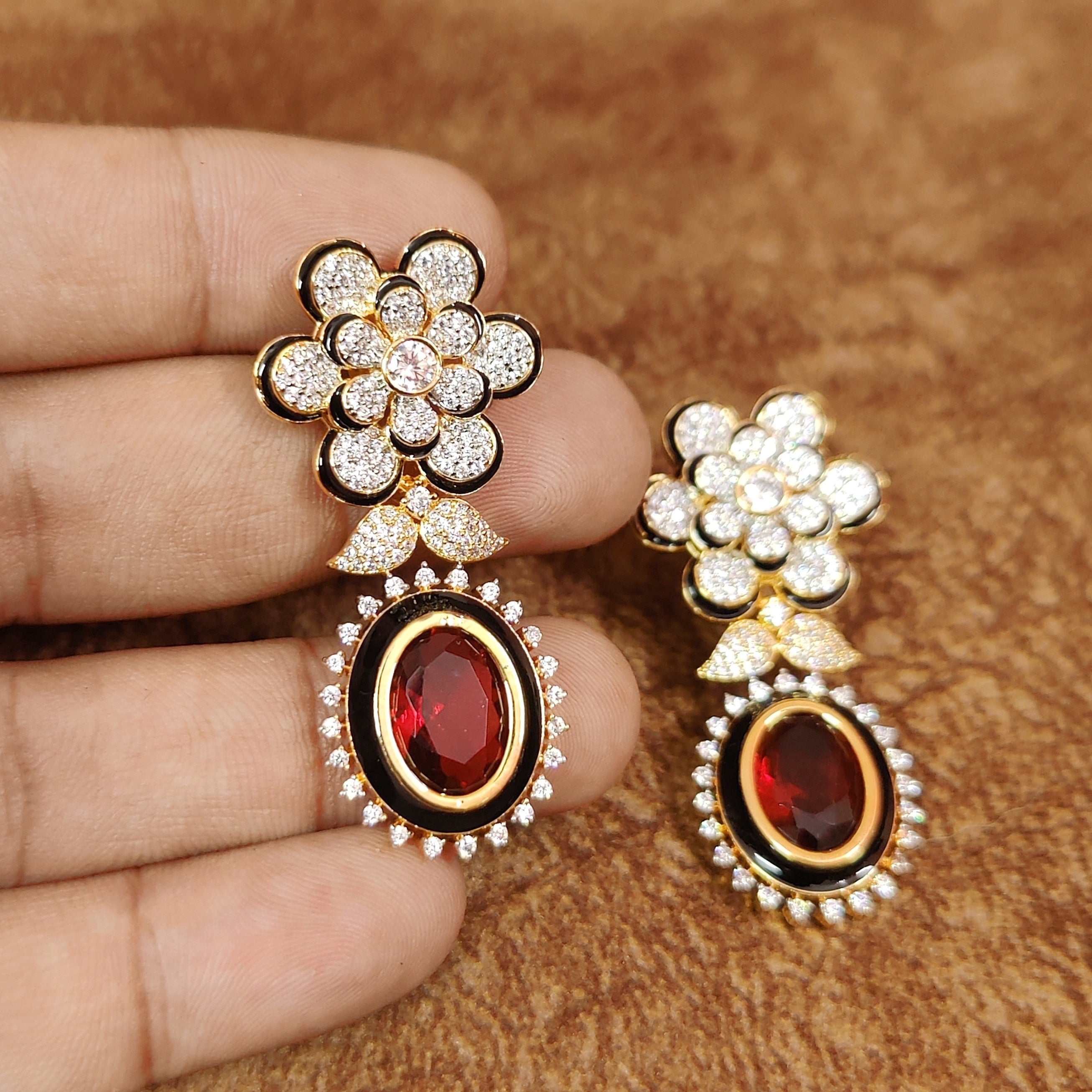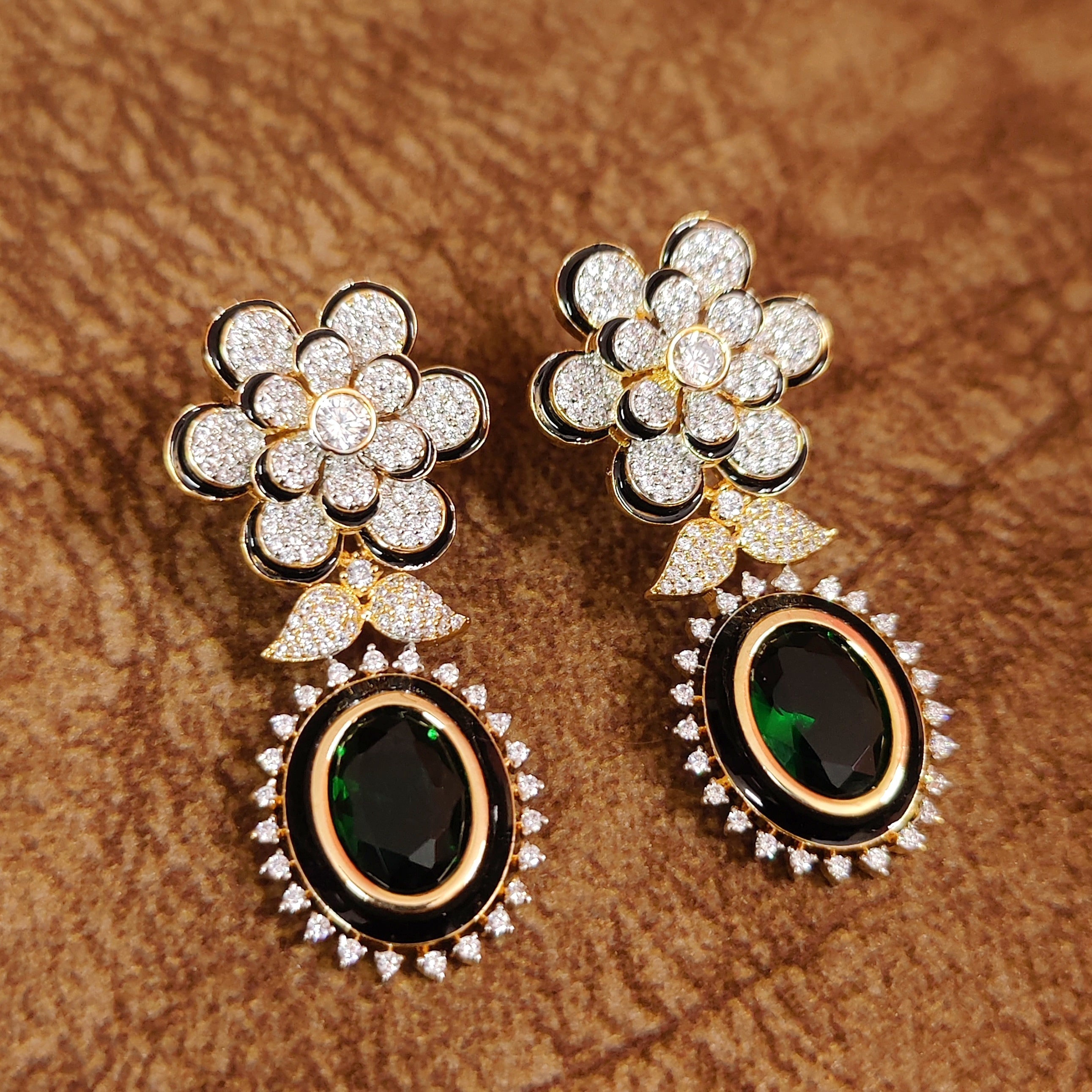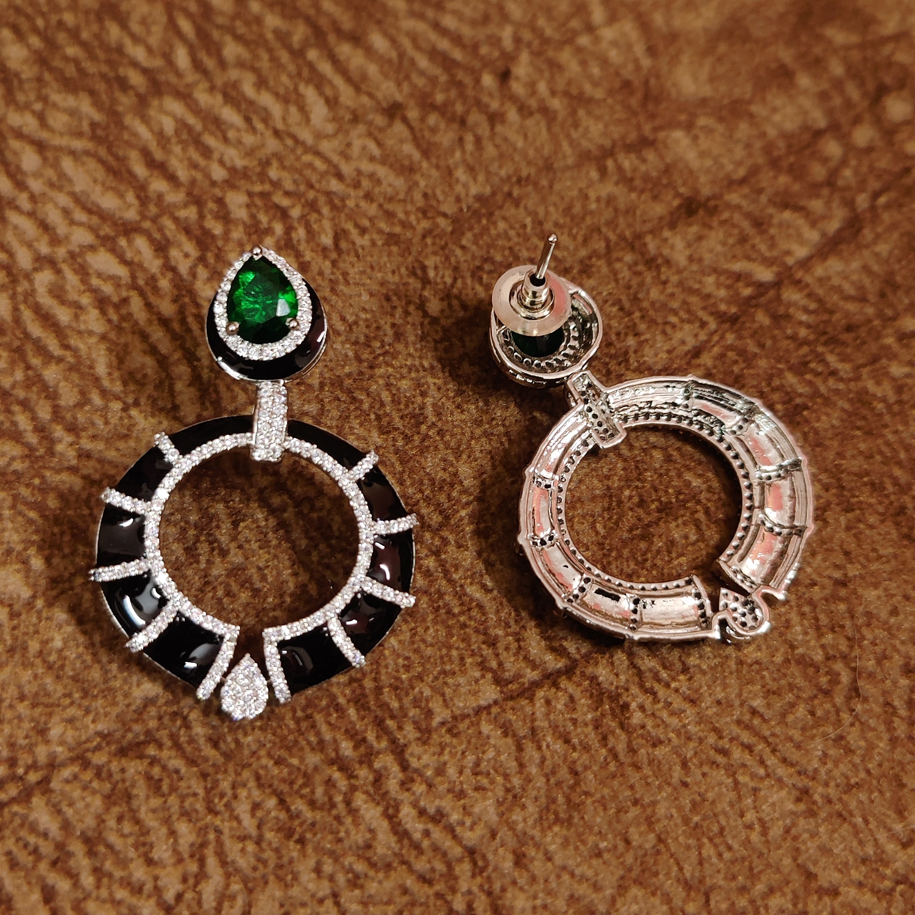 Add a touch of elegance to your outfit with our stunning Emerald Danglers. These earrings feature vibrant emerald colour cz stones paired with the finest quality american diamond. The intricate black meenakari work adds a unique touch to the modern design. Made with lightweight gold plating, they are perfect for any occasion.