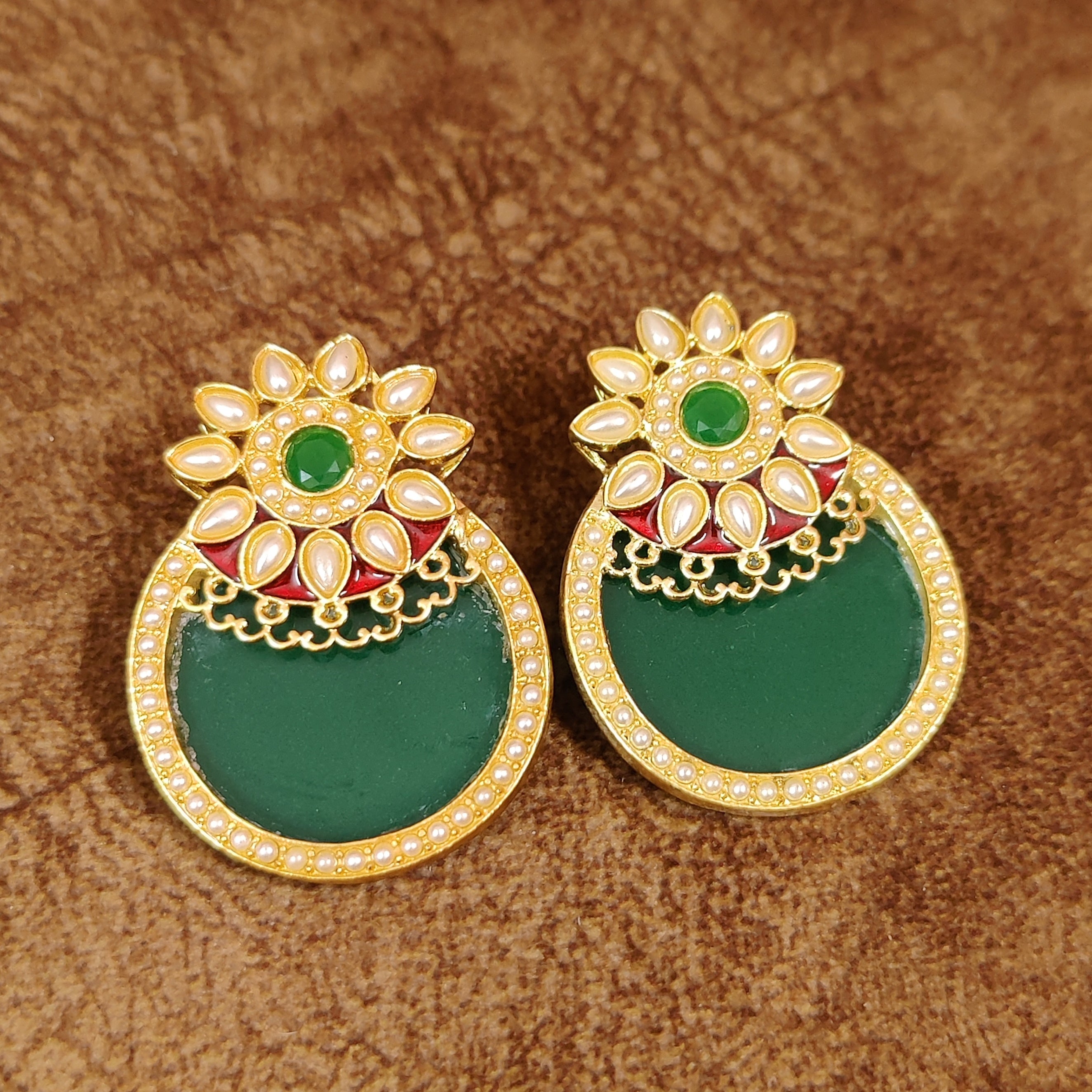 Enhance your elegance with these Green Stone Pearl Earrings, a perfect blend of sophistication and tradition. Featuring lustrous pearls and vibrant green stones, these earrings are set in a gold-plated finish, adding a royal touch to any outfit. Ideal for festive occasions, weddings, and special events, these earrings are a must-have for those who love timeless beauty.
