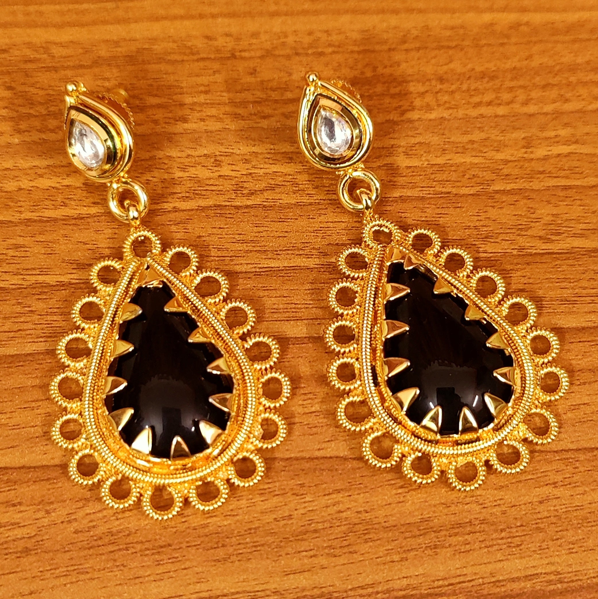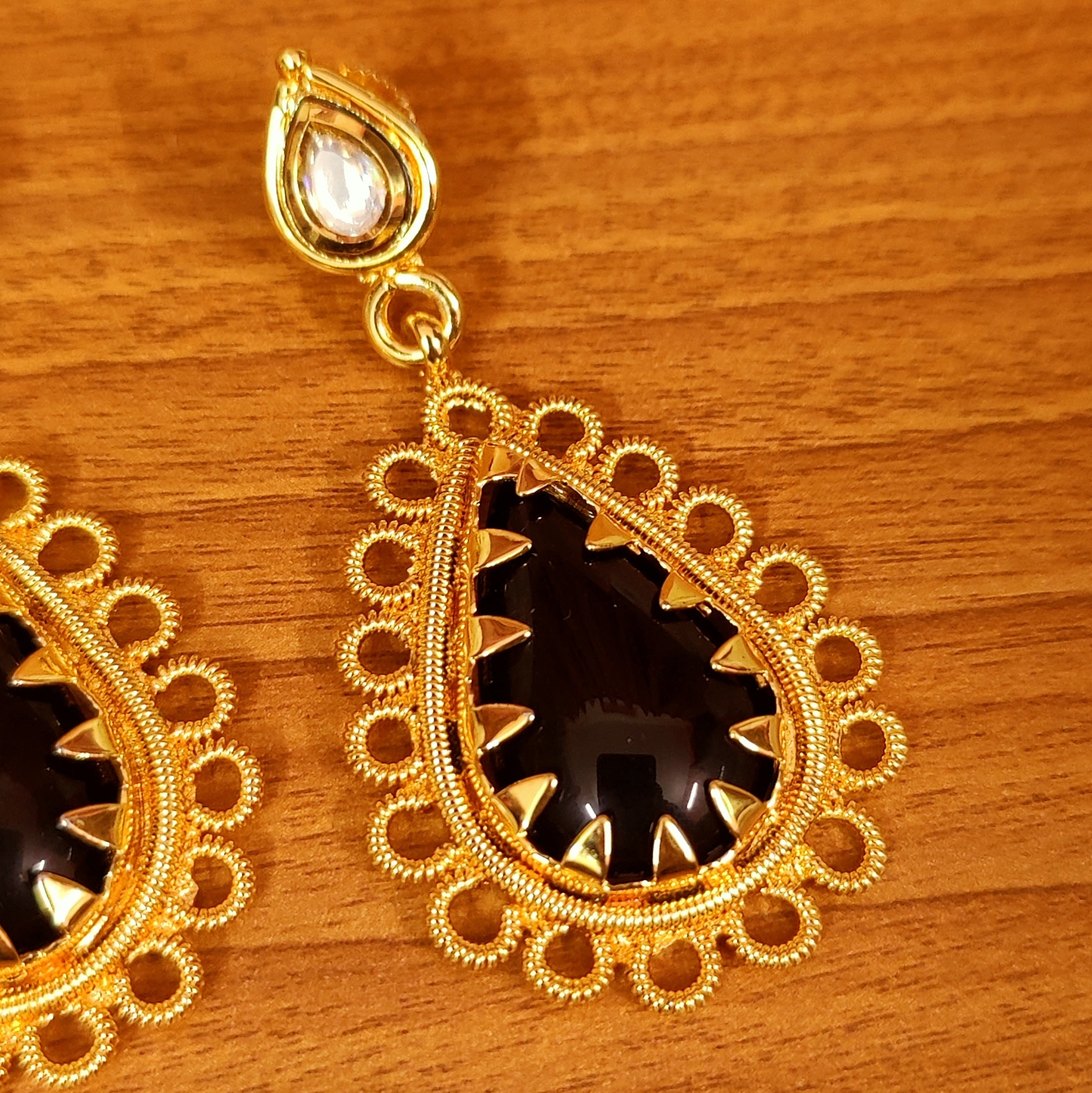 KUNDAN LOOK GOLD PLATED PEAR SHAPED BLACK EARRINGS