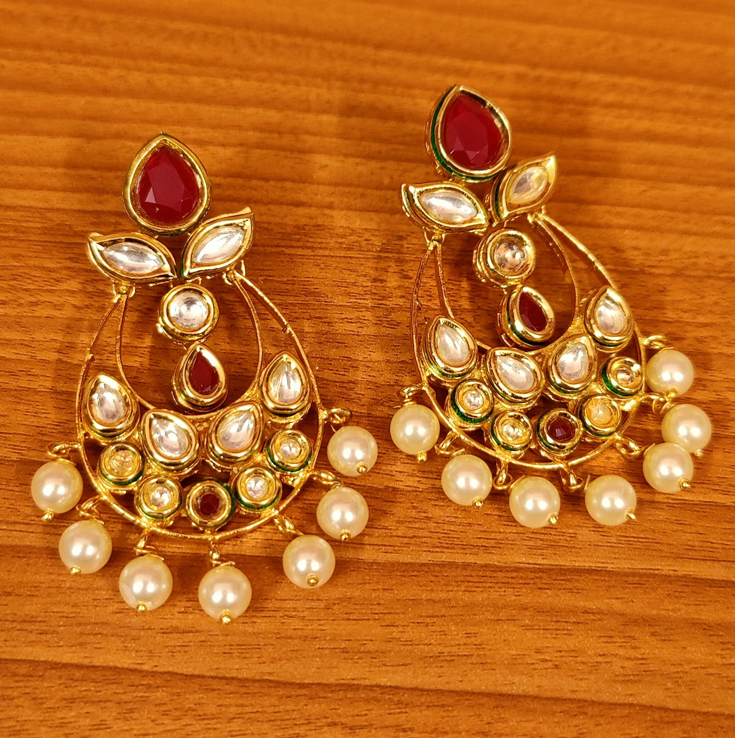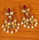 These medium size kundan chandbali earrings are handcrafted in silver alloy with imitation red colour stones and kundan polki stones of very fine quality . These gorgeous earrings are plated with real 18kt fine nickel free gold rhodium that gives a unique look to the design , the earrings are finely crafted and are perfect for occassional wear.