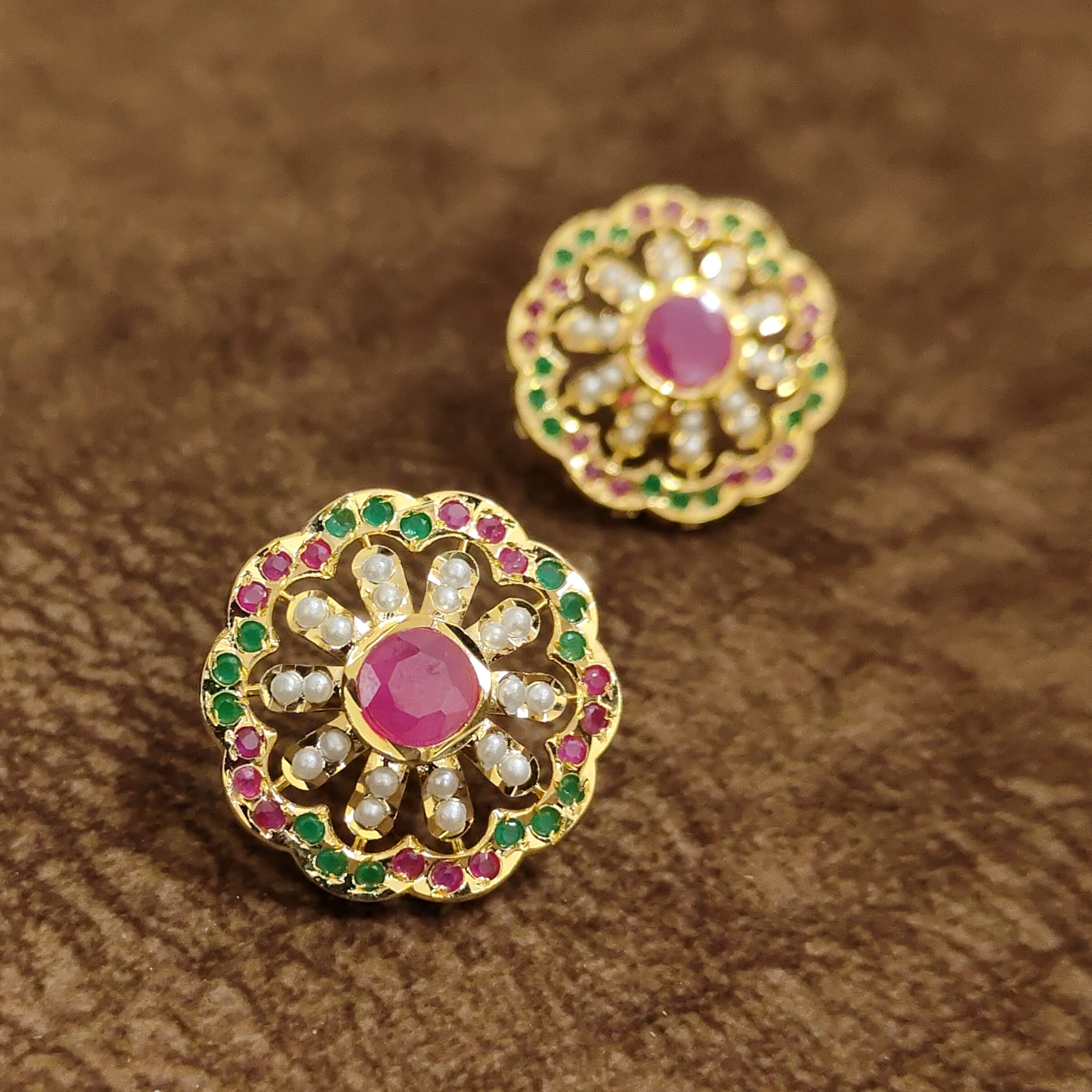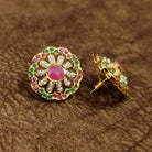 Elegant ruby floral stud earrings featuring a radiant ruby center surrounded by delicate pearl petals and emerald-ruby stone detailing. These designer artificial jewellery earrings add a luxurious ethnic charm, perfect for weddings, festive occasions, and traditional outfits worldwide.