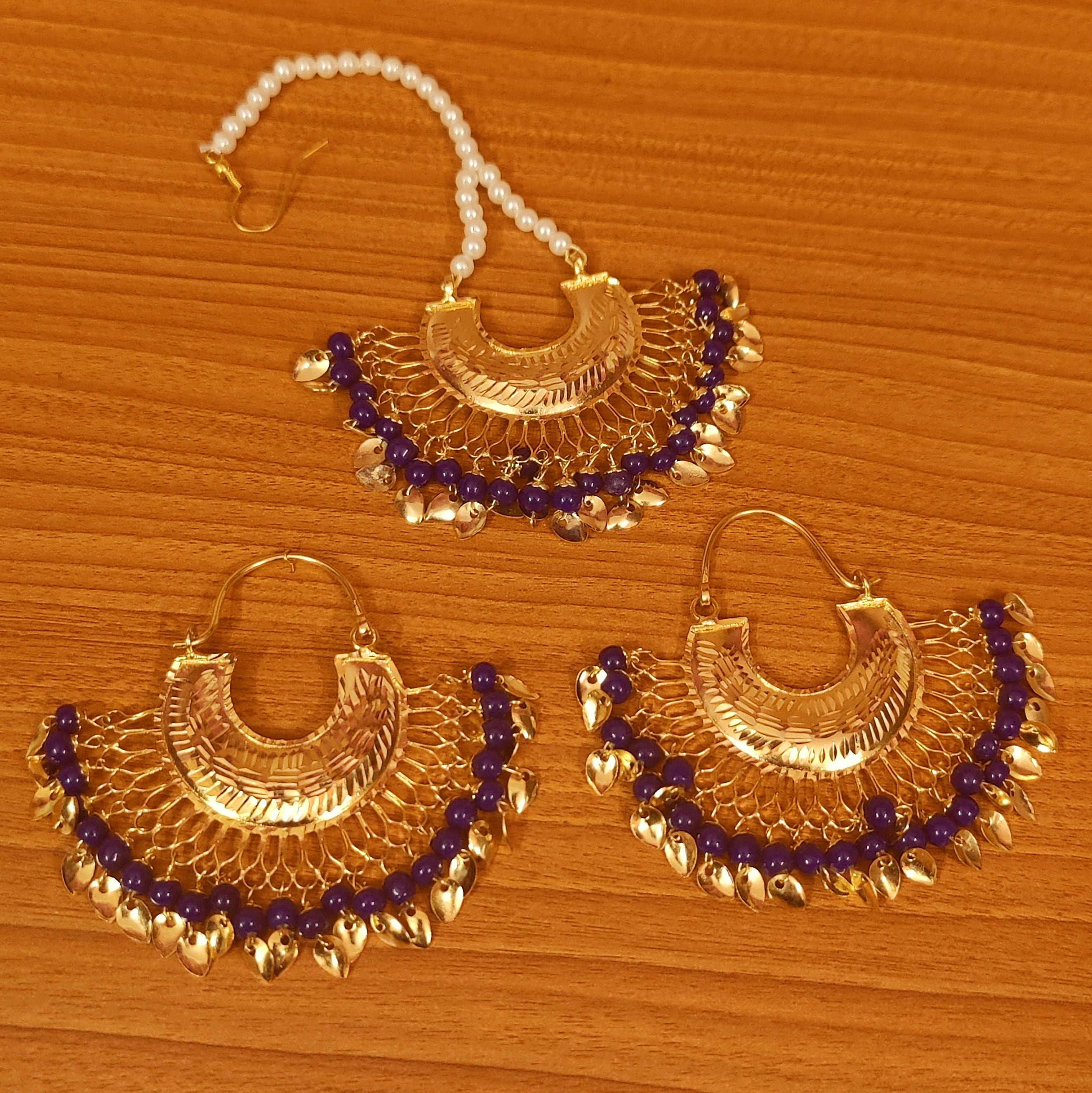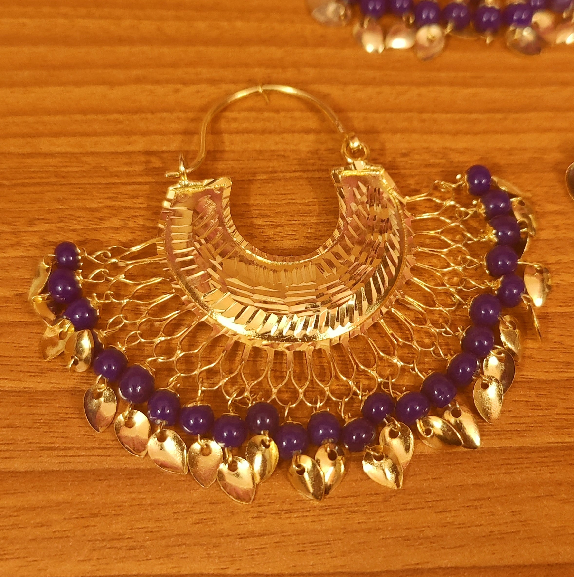 These gorgeous chaandbaali hoop earrings are handcrafted in copper alloy with imitation blue crstal beads and gold plated leaf petals. These artistic yet modern earrings are plated with fine nickle free gold rhodium to avoid any allergies to the skin.