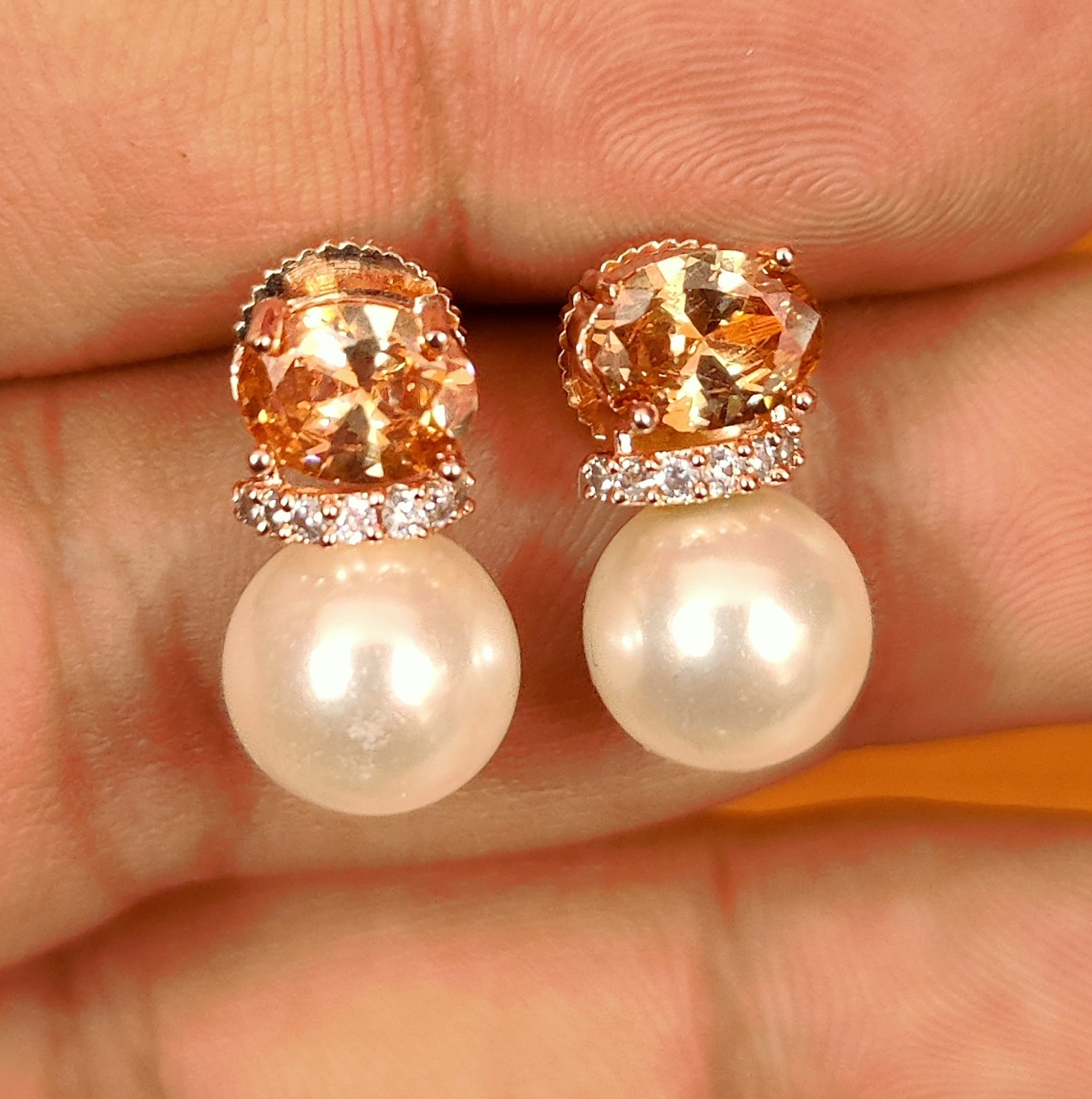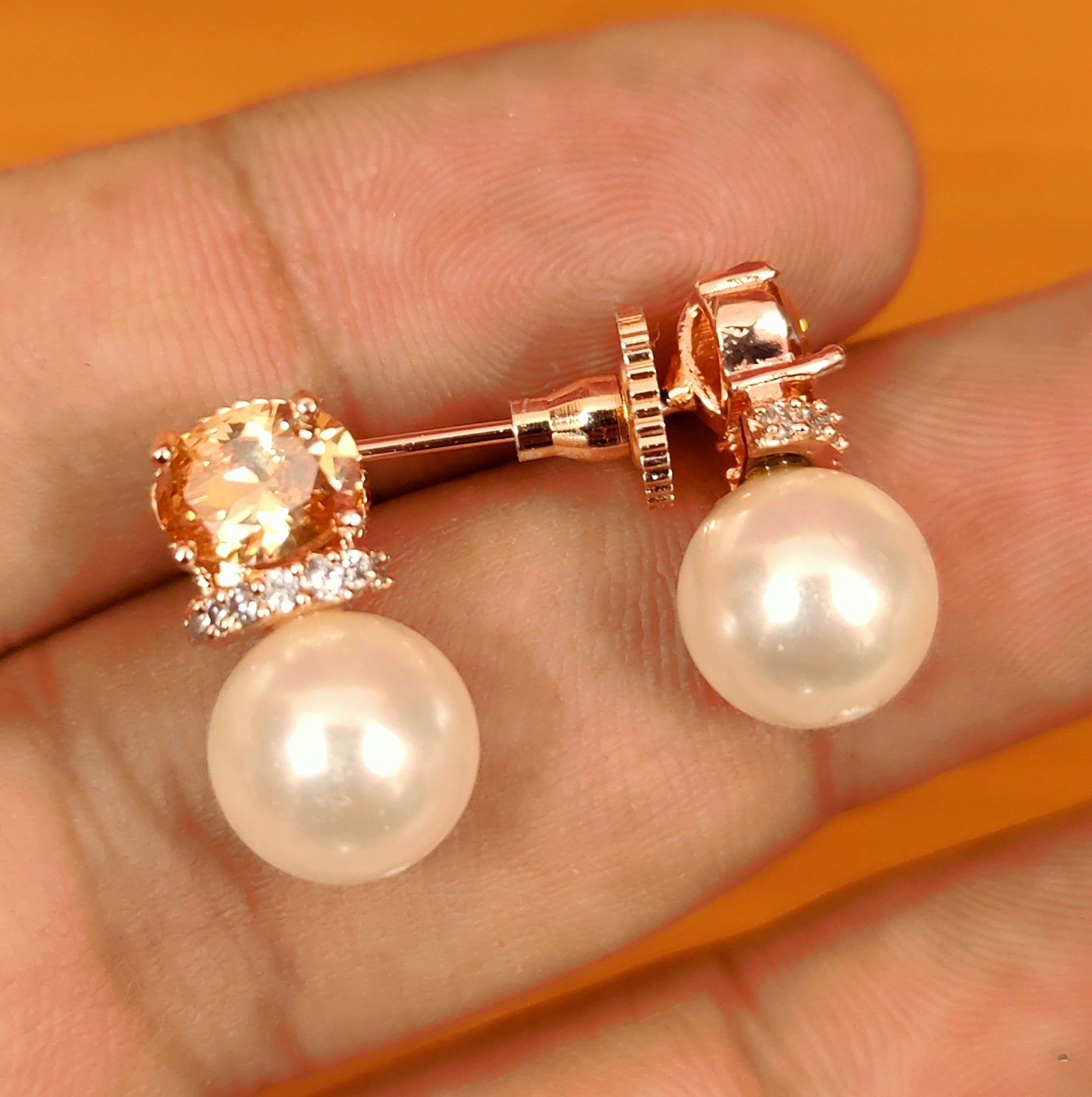 These beautiful studs are handcrafted in brass alloy with imitation citrine colour stone & cz stone and pearls work of very fine quality. these artistic yet modern earrings are plated with high quality rose gold rhodium. the earrings are very light in weight.