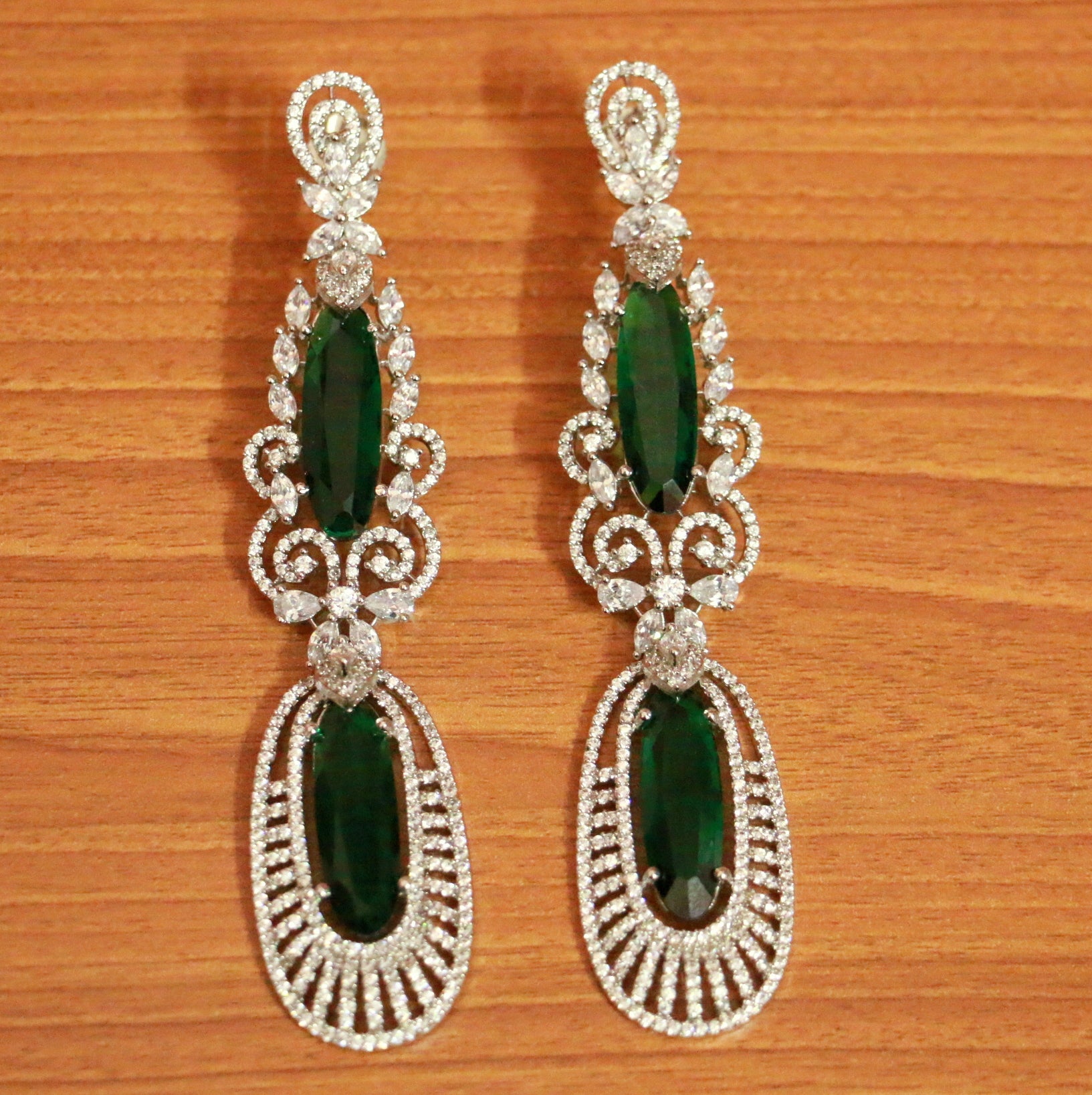 These diamond look earrings are handcrafted in silver alloy with imitation green onyx colour stones & cz stones of very fine quality. These earrings are plated in 18kt gold rhodium plating which gives the design a real jewelry look .