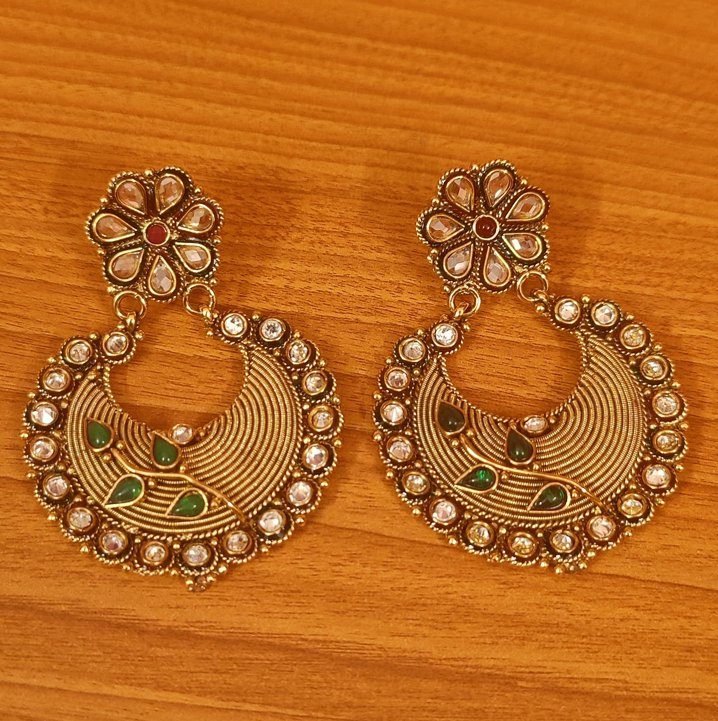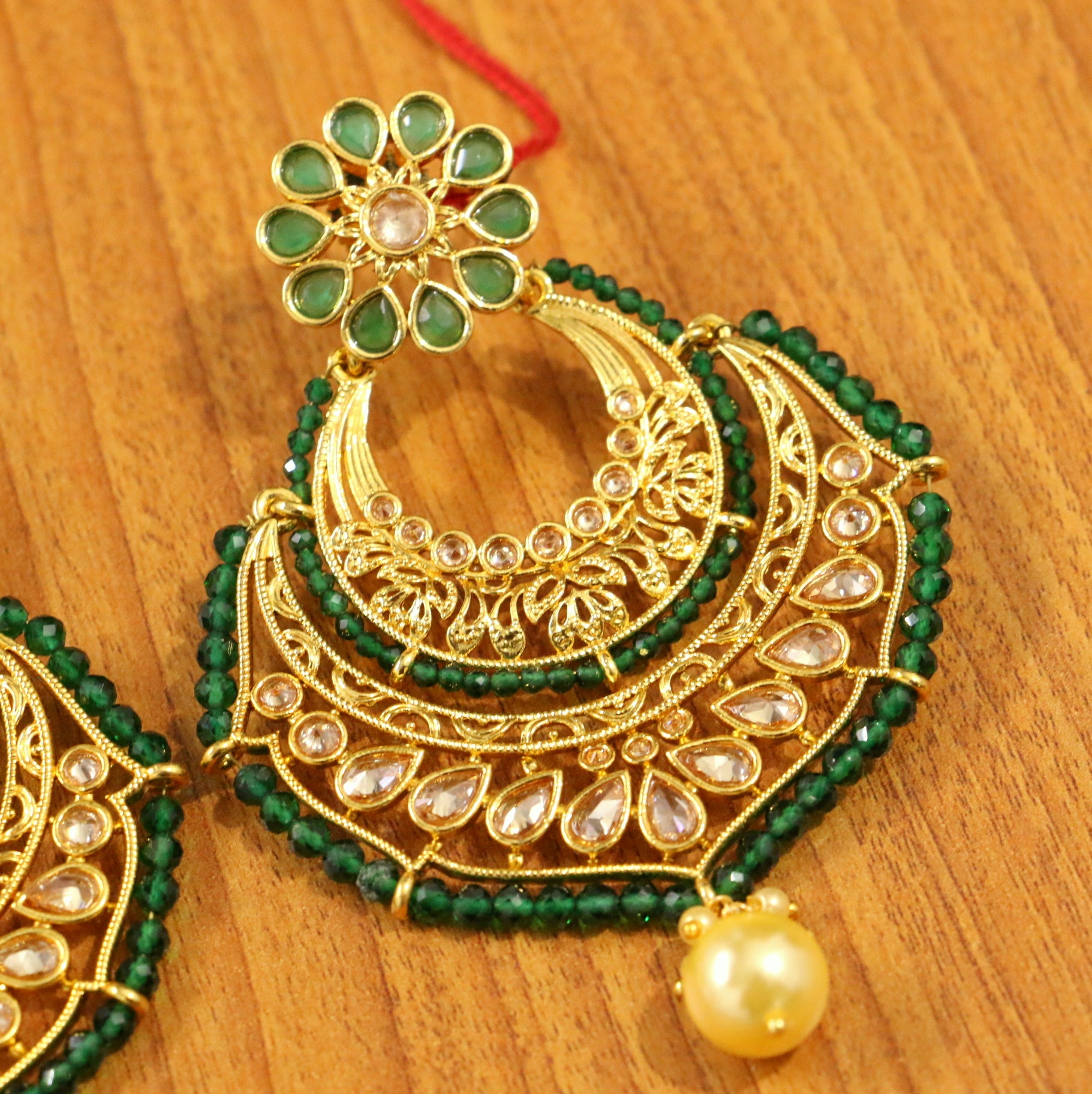 This beautiful chandbali is handcrafted in coper alloy with imitation green onyx,pearl & zircon work of very fine quality . This chandbali is coated with 18 kt gold polish which give them a unique look . An absolutely stunning piece to own and are very light in weight.