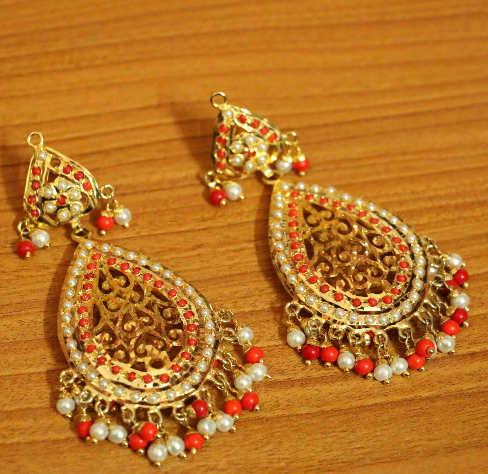 This Jadau look earring is handcrafted in brass alloy with imitation pearls and orange stones of very fine quality. These earrings are very light in weight and are coated with 18kt gold polish which gives you a complete new look .
