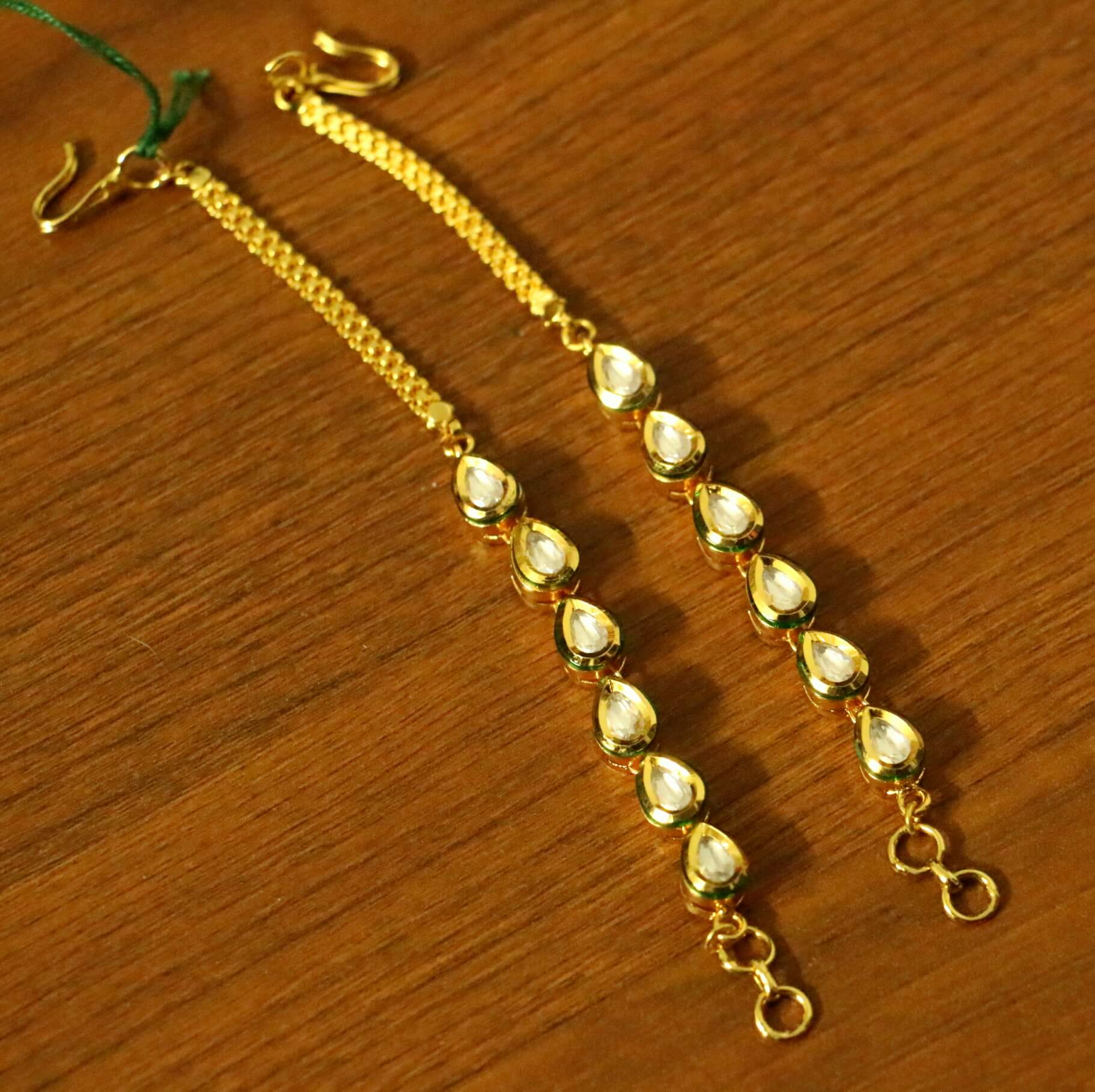 These beautiful pear shaped ear chain are handcrafted in brass alloy with imitation kundan with meenakari work of very fine quality. These ear chain are coated with 18 kt gold polish which give them a unique look . An absolutely stunning piece to own and are very light in weight.