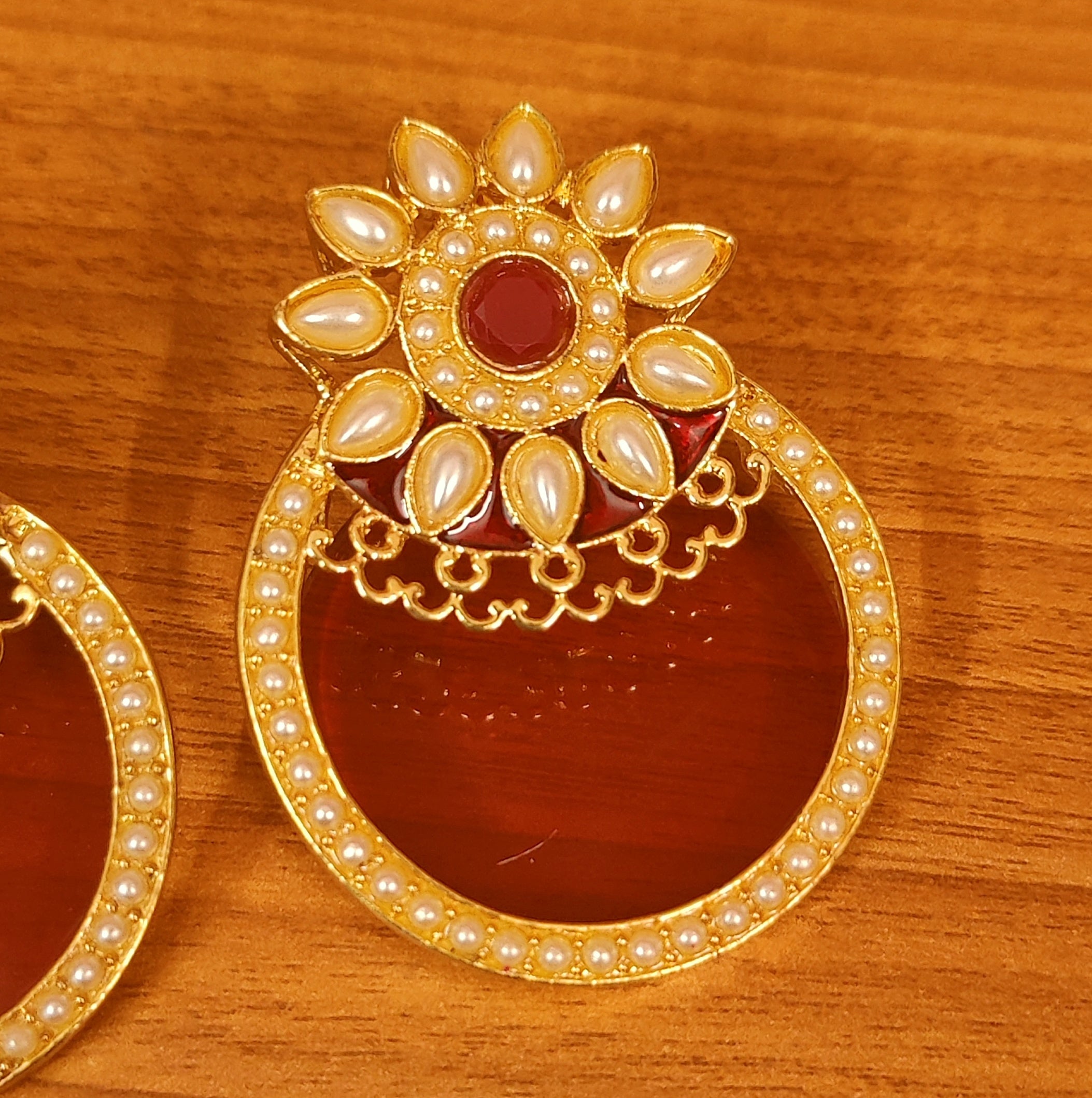 These red meenakari earrings are handcrafted in copper alloy with imitation pearls and pinkish red colour glass stone with meenakari work of very fine quality. These party wear earrings are plated with 18kt antique gold plating which gives the design a real gold look , the earrings are very light in weight and are perfect for occasional wear.