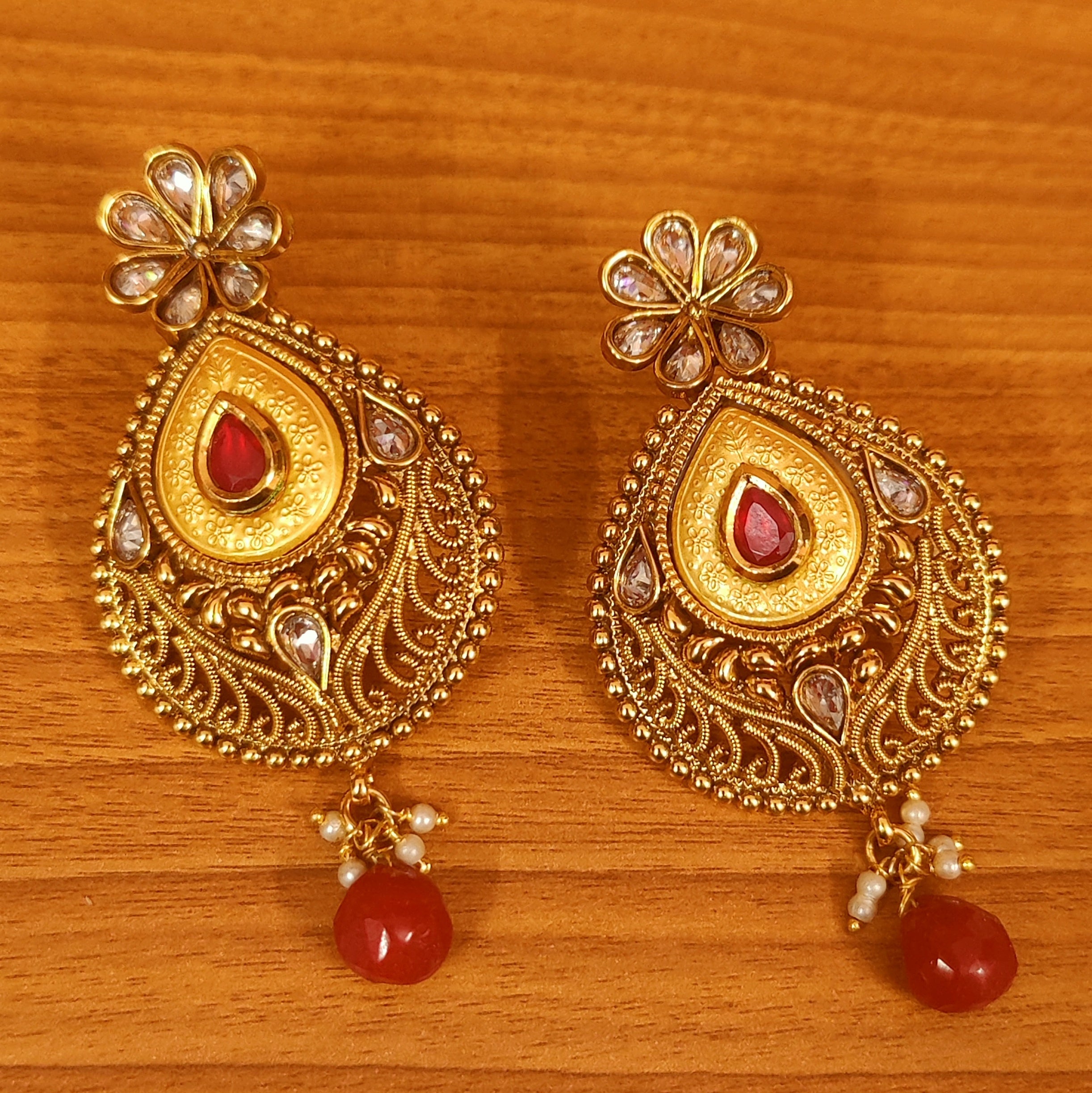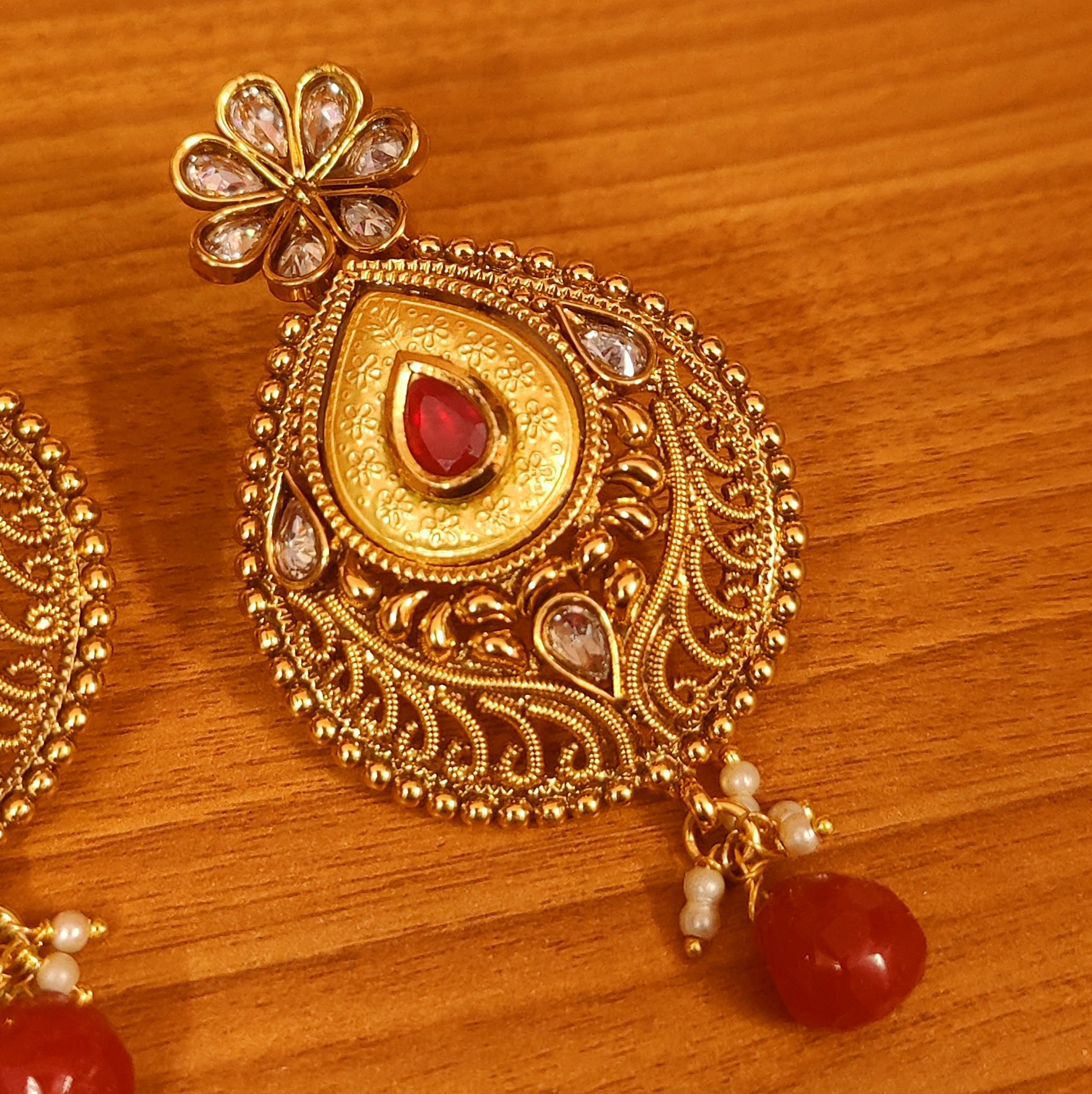 These gold plated filigree earrings are handcrafted in copper alloy with imitation red colour stones and polki stones of very fine quality. These party wear gold look earrings are plated with 18kt antique gold plating which gives the design a real gold look , the earrings are light in weight and are perfect for occasional wear.