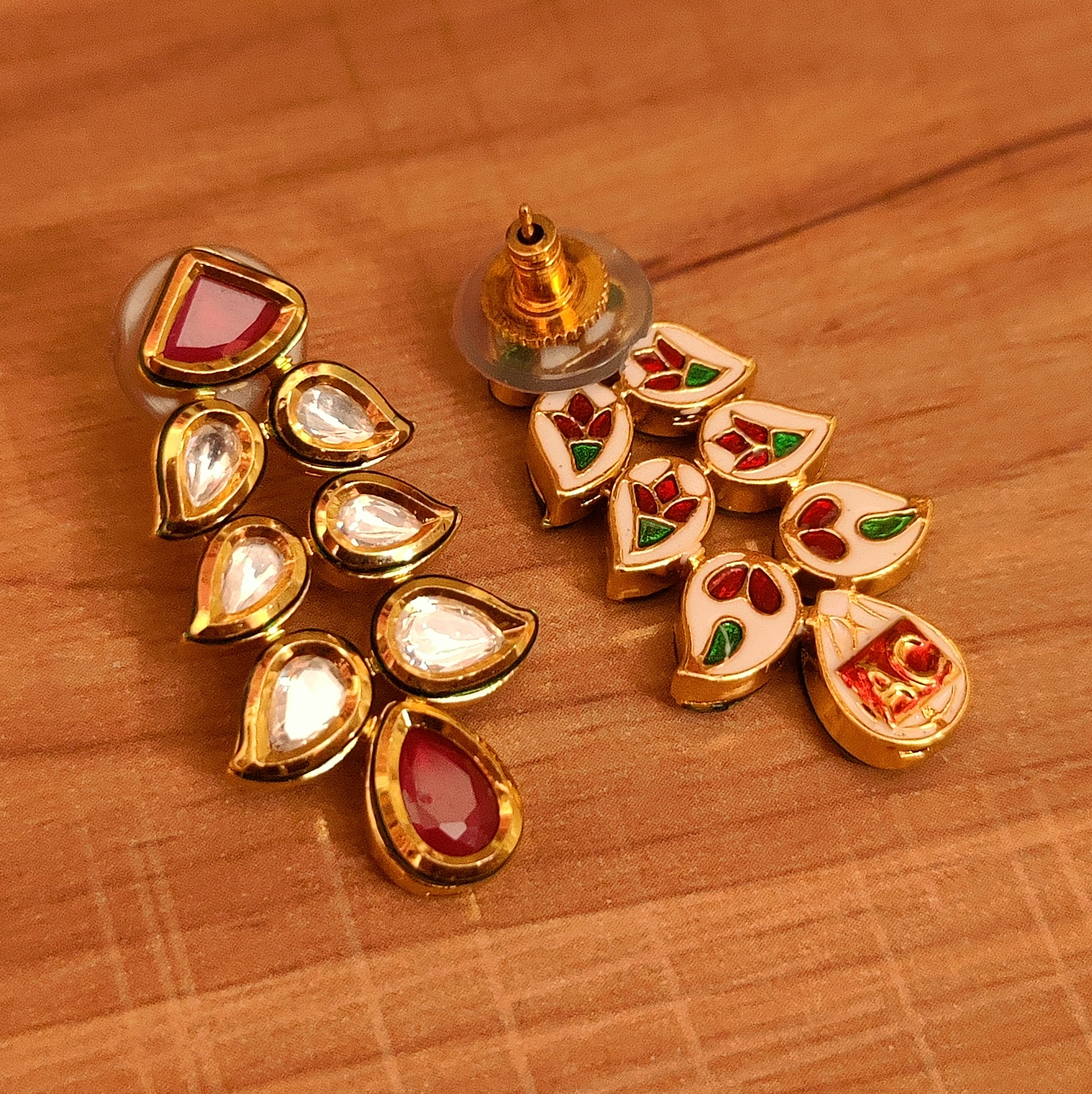These beautiful earrings are handcrafted in brass alloy with imitation red colour stone and kundan with meenakari work of very fine quality. these artistic yet modern earrings are plated with high quality gold rhodium. the earrings are very light in weight.