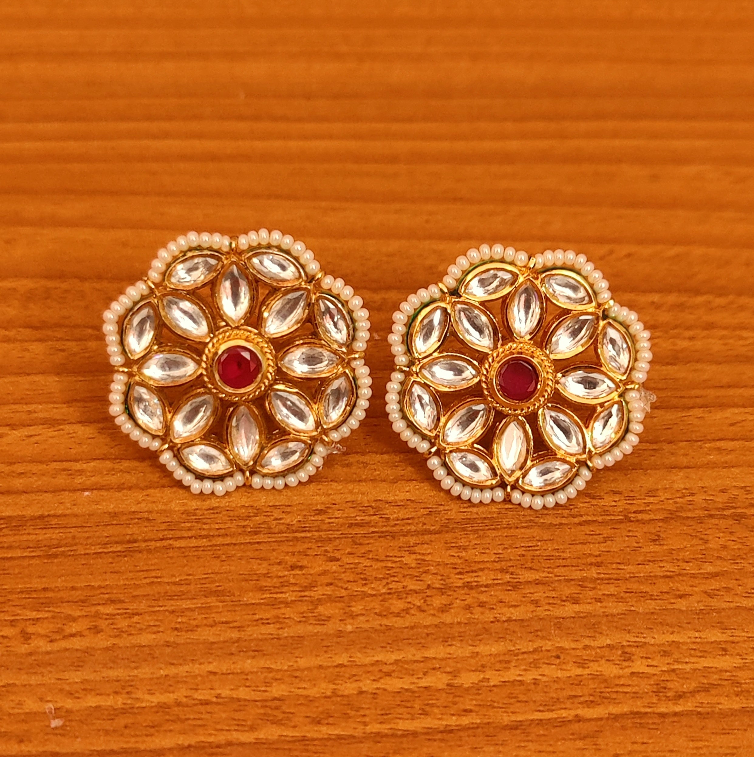 These beautiful kundan polki studs are handcrafted in brass alloy with imitation red colour stone & kundan work of very fine quality. these artistic yet modern earrings are plated with high quality gold rhodium. the earrings are very light in weight.