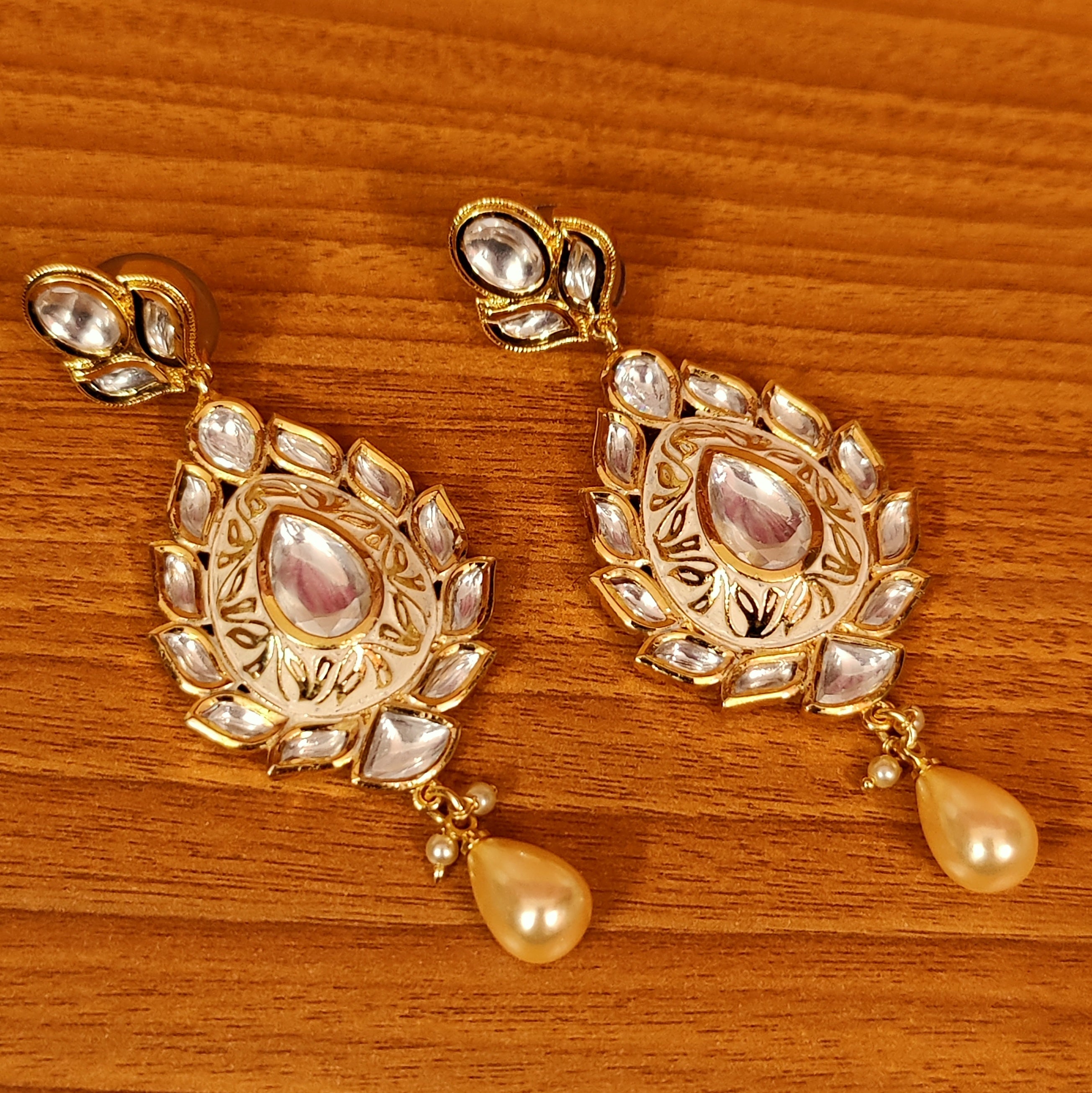 These kundan polki danglers are handcrafted in silver and brass alloy with imitation pearls & kundan polki stone of very fine quality. These party wear danglers are plated with real 18kt fine nickel free gold rhodium to avoid any allergies to the skin.
