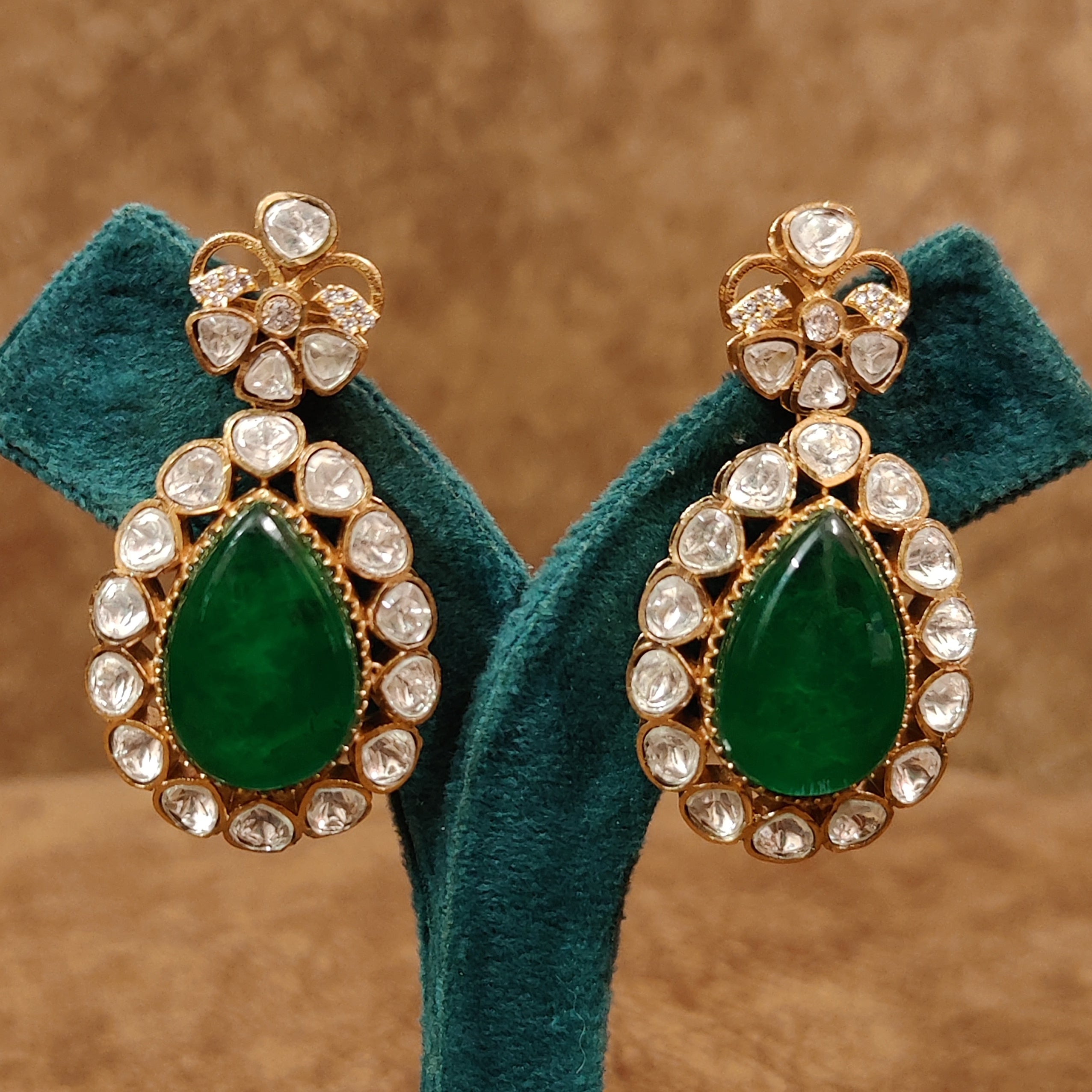 EMERALD DOUBLET STONE STUDDED GOLD PLATED MOISSANITE POLKI DANGLERS