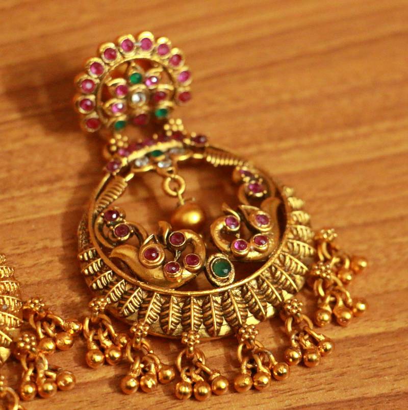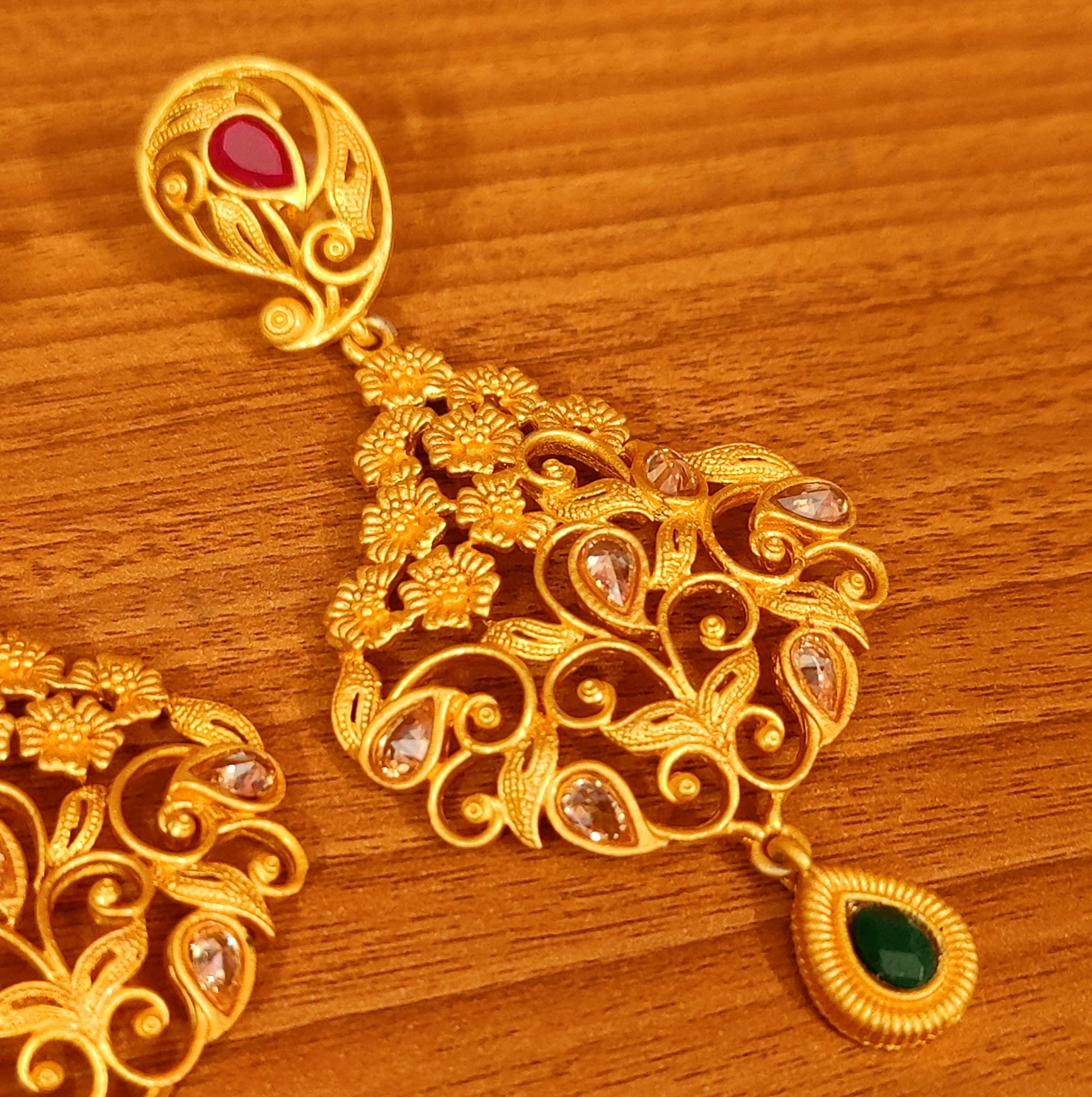 RUBY & EMERALD KUNDAN POLKI ANTIQUE GOLD CHANDBALI EARRINGS