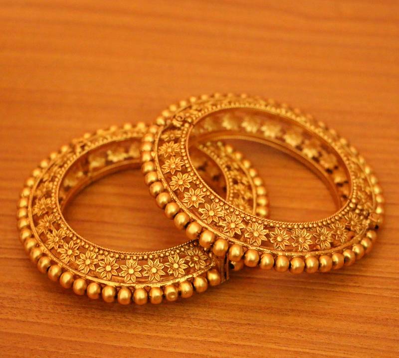 These matt gold look bangles are handcrafted in copper alloy with flower pattern motifs and matt gold plating work of very fine quality. These artistic yet modern bangles are plated with fine nickle free matt gold rhodium to avoid any allergies to the skin.