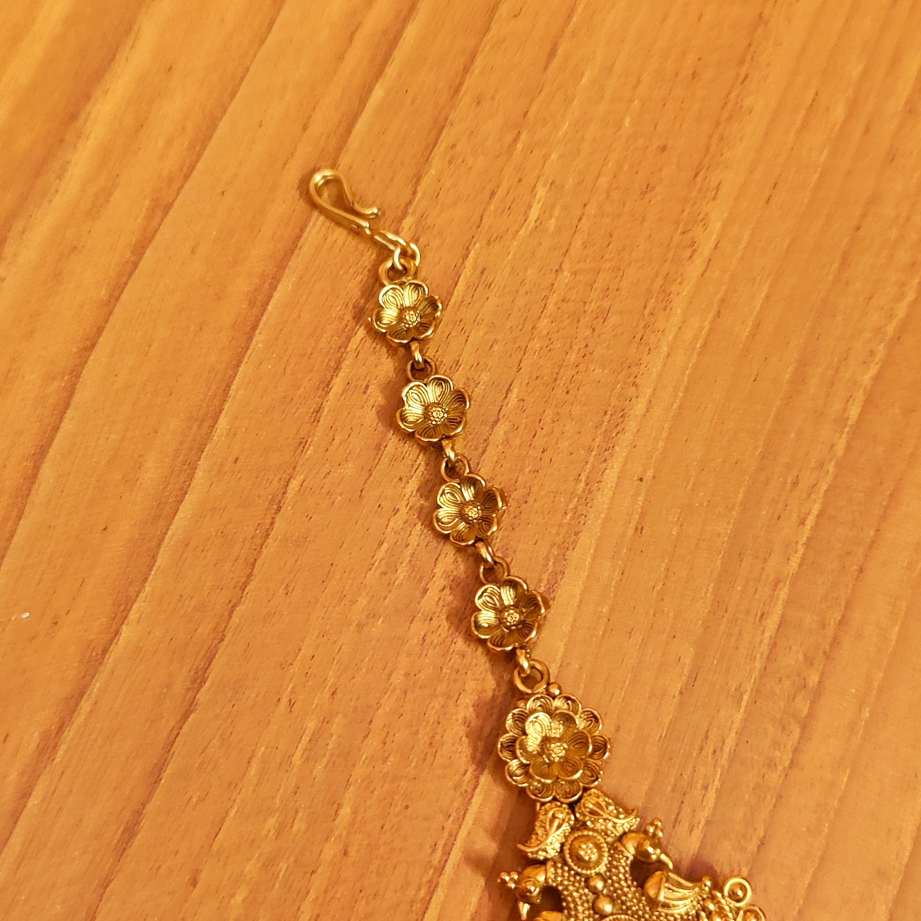 This beautiful bridal look mathapatti is handcrafted in copper alloy with minute & intricate gold work of very fine quality . This mathapatti is coated with 22 Kt matt gold plating which gives a very real look to the design . An absolutely gorgeous piece and is very light in weight.