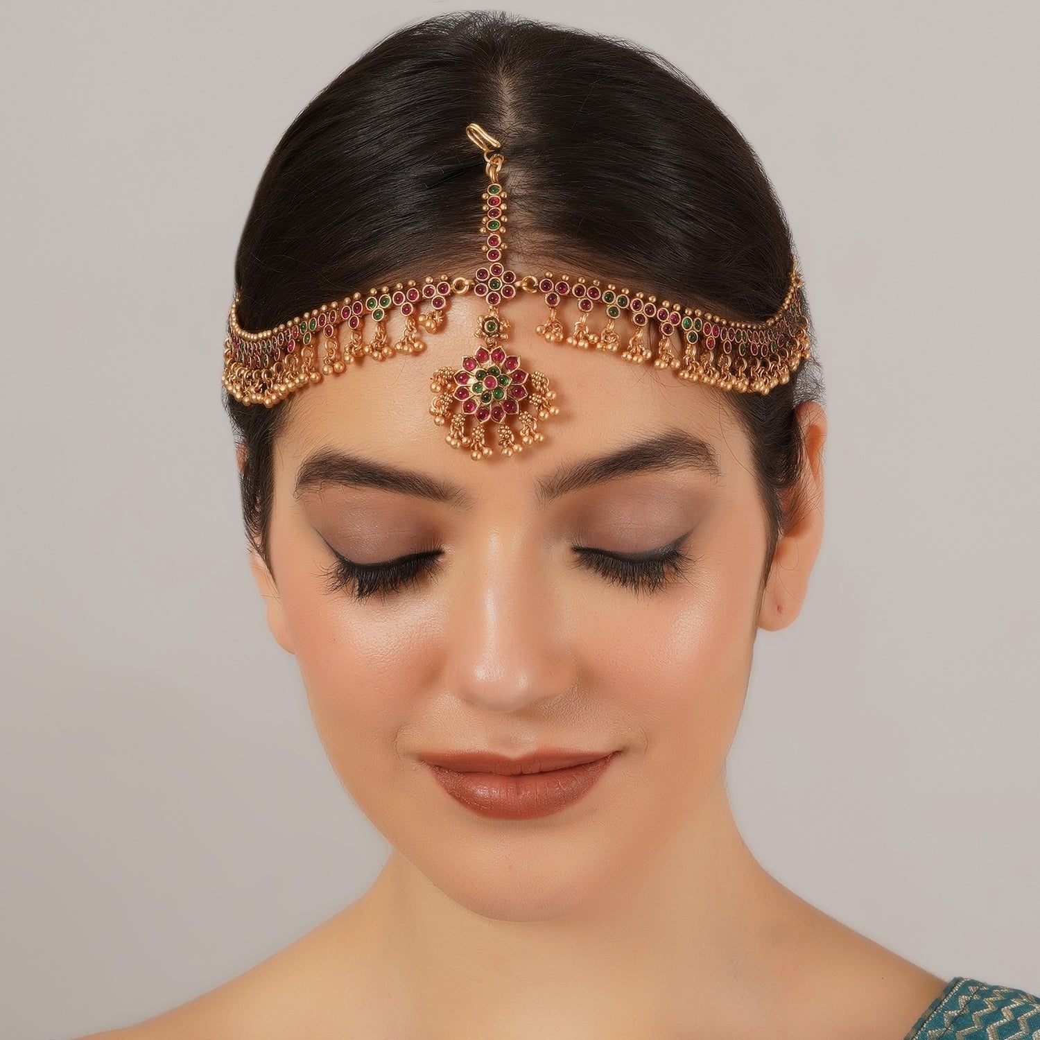 This beautiful bridal look mathapatti is handcrafted in copper alloy with minute & intricate gold work of very fine quality . This mathapatti is coated with 22 Kt matt gold plating which gives a very real look to the design . An absolutely gorgeous piece and is very light in weight.