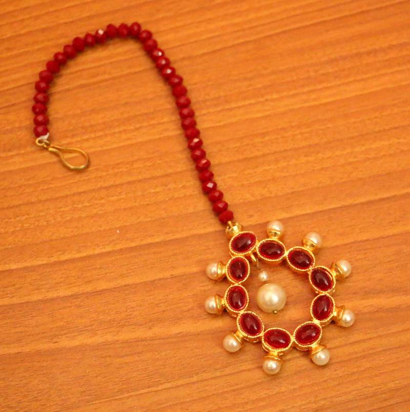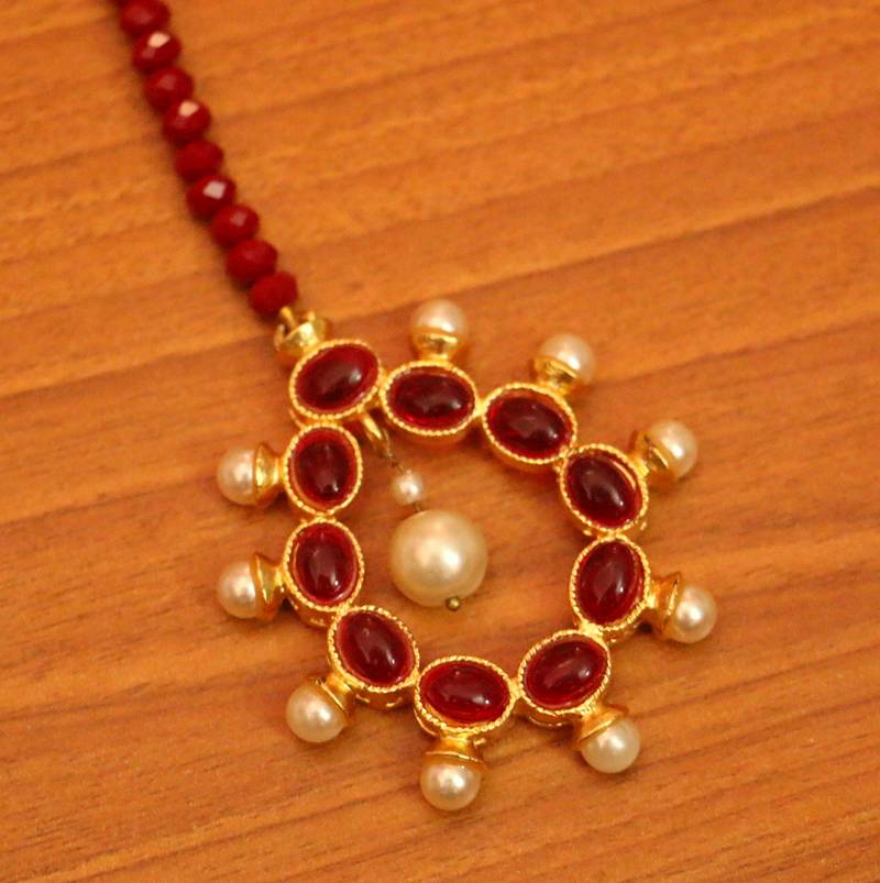 This polki studded maang tikka is handcrafted in copper alloy with imitation pearls & ruby colour stones of very fine quality . This maang tikka is coated with gold rhodium plating as done on the real jewellery . The design itself looks very real and is perfect for wedding wear.